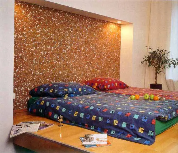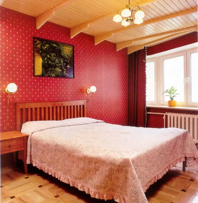 Цей простий і досить економічний дизайн намагається розширити візуальну зону навколо ліжка за рахунок контрастного поєднання кольорів стін, підлоги і стель: темні стіни між світлішою підлогою і стелею візуально звужують стінку, роблячи її менш «значущою» у просторі.