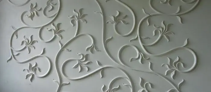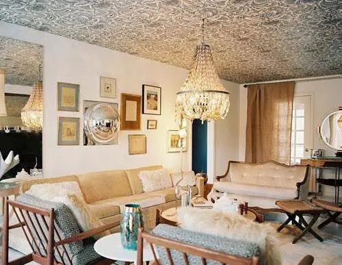 Оклейка потолка обоями продовжує дизайн стін у гостьовій. Такий прийом використовується при комбінуванні шпалер, коли частина стіни оклеюється певним видом шпалер і ця смуга триває на потолку. Також стіни і потолок можуть бути оклейовані одними чи різними обоями. Існують різні види шпалер, але найпростіші в нанесенні – це рідинні, або декоративна штукатурка.