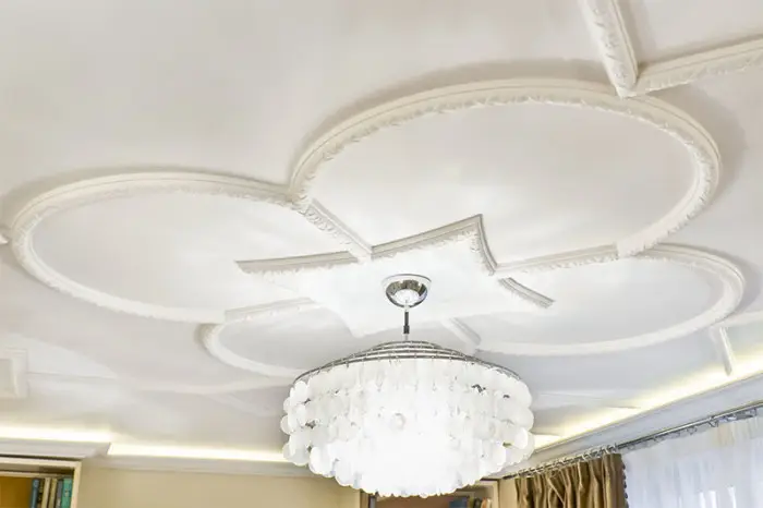 Щоб зробити потолок завершеним і цікавим, допоможуть молдинги по його периметру. Для гостьової в класичному стилі можна використовувати більш широкі молдинги, англійський або готичний стиль допоможуть створити поперечні молдинги, які ділять потолок на квадрати.