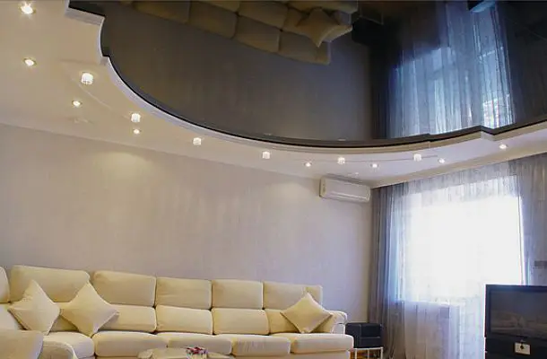 Натяжні потолки – ще один варіант для вирішення проблеми надзвичайно нерівного потолка. Серед матових і блеску натяжних потолків різних кольорів можна щось підібрати практично для будь-якого інтер'єру. Блеску натяжний потолок завдяки відблисковому ефекту сприяє візуальному збільшенню приміщення. Найчастіше такі потолки використовуються у оформленні в сучасних стилях гостьових.