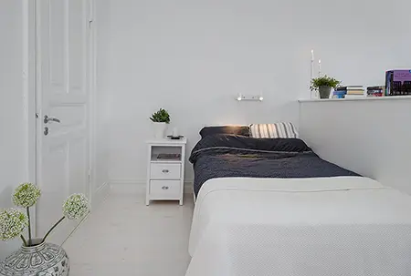 Функціональний інтер'єр кімнати в шведській квартирі виконаний без зайвих конструктивних рішень: навіть перегородка, що відокремлює спальну зону від громадської, збудована не на висоту стін, а лише на третину висоти, не перекриваючи доступ світла до кожного кутка приміщення.