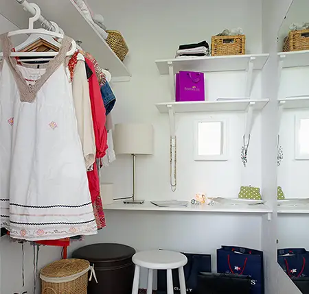 Фото 6 — Площа гардеробної дозволила не лише розмістити в ниші одяг, а й обладнати маленький туалетний столик для господині