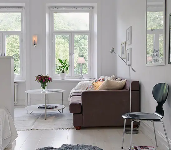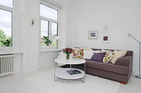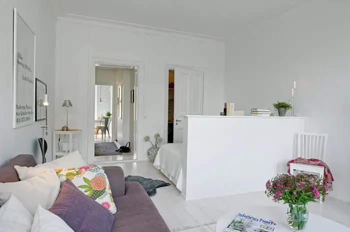 Інтер'єр кімнати в однокімнатній квартирі виконаний у традиційному скандинавському стилі: основний колір облицювання приміщення і корпусів меблів — кипенно-білий, меблі на вигляд надзвичайно прості, але одночасно дуже функціональні, а невеликі кольорові акценти і елементи декору роблять кімнату затишною (багато з елементів декору можна зробити і власноруч, що ще більше «одомашнює» кімнату). Така квартира економ-класу підійде як для холостяка, що любить часті вечірки, так і для молодої родини, якій потрібен укромний куток.