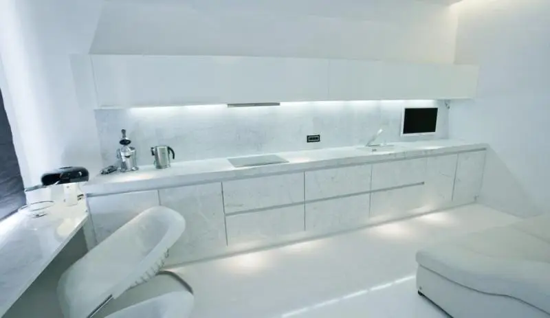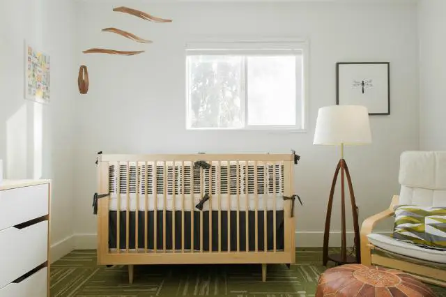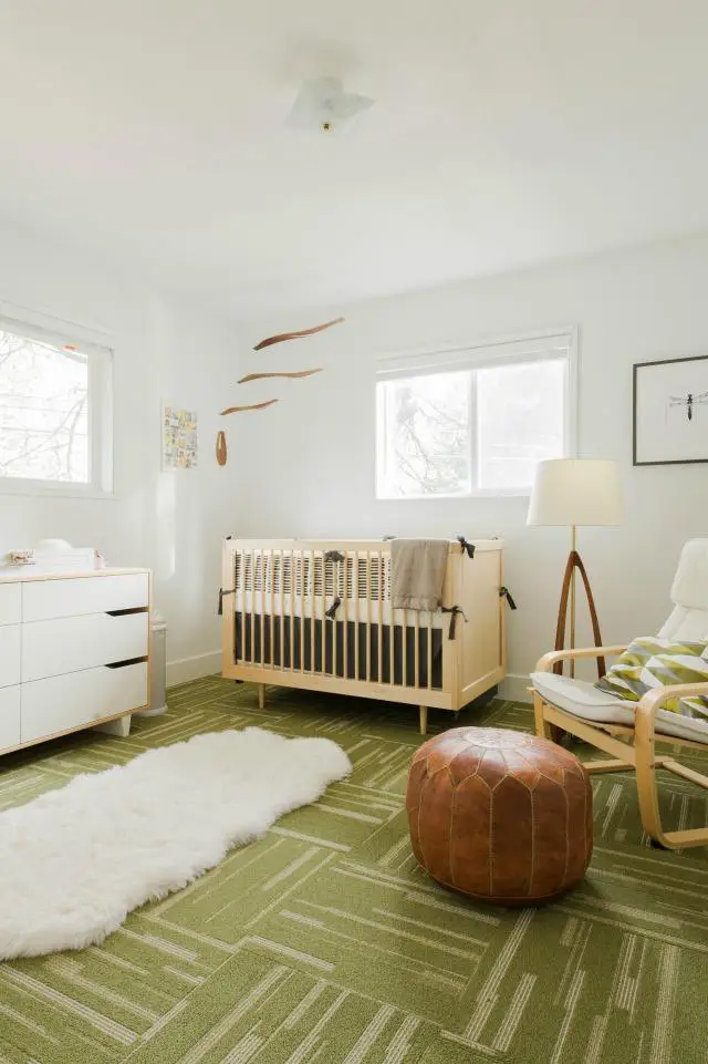 Коли вона працювала над інтер’єром цієї дитячої кімнати, саме тоді була вагітною дитиною Ліберті. Перше, що зробила Кеті — позаботилася про те, щоб у кімнаті було світло. Для цього вона використовувала білий колір. Його розбавляють елементи зеленого відтінку, дерево і модний марокканський пуф із натуральної шкіри.