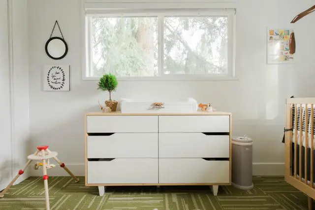 Природні мотиви знайшли відображення і в предметах декору. Одним із них є горщик із невеликим вечнозеленим деревцем. Він розташований поруч із пеленальним столиком. Нагадаємо, його роль виконує комод із шістьма ящиками, на якому стоїть ще один ящик, в який саме потрібно класти новонародженого.