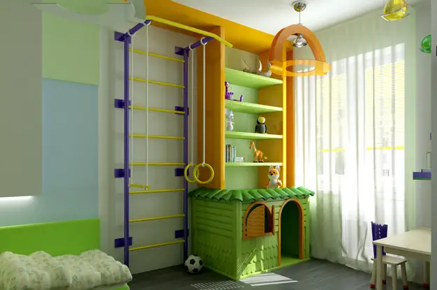 Хлопчики мають бути сильними та спортивними, тому не поленіться і купіть дитині у кімнату спортивний куток. Це може бути просто вертикальна драбина, на якій можна робити незамислені вправи, або ж повноцінна шведська стінка з брусьми та кільцями. Але вот футбольний м'яч зберігати в кімнаті ми не радимо, інакше всі скляні предмети з кімнати зникнуть.