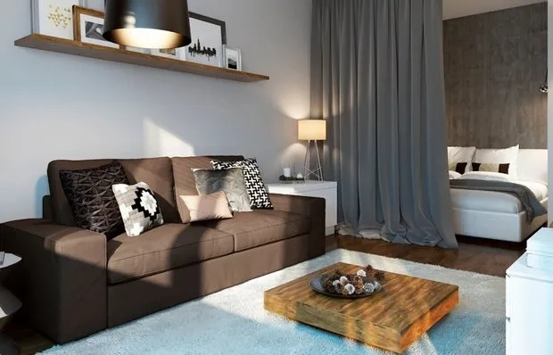 - Виділяємо зони меблями — шкафом або диваном, стелажем або етажеркою. Останній варіант — модний і актуальні, особливо для компактних кімнат.