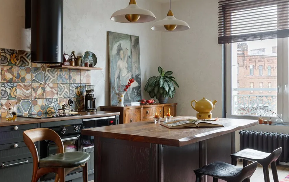 Круглий стіл у обідній зоні доповнили відновленими стільцями середини минулого століття. Для відпочинку у гостиній передбачено великий модульний диван. Над ним — унікальне панно, яке раніше прикрашало стіну у столовій на Івановській ткацько-віддільній фабриці. Яскравий вінтажний килим став ефективним акцентом, який візуально виділяє місце для відпочинку.
