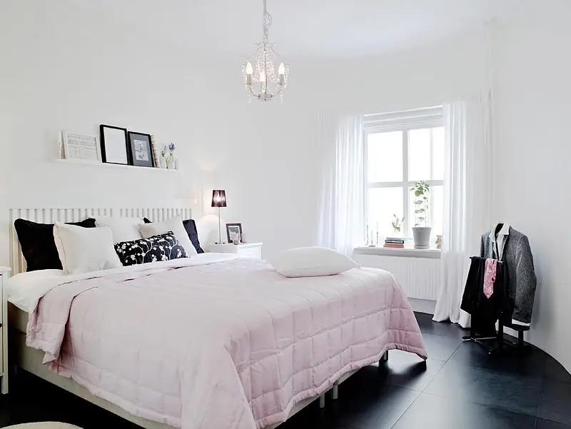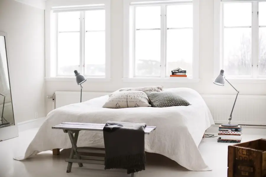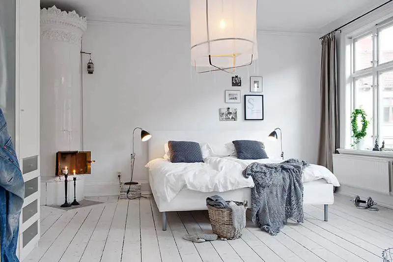 У скандинавському стилі функціональність, зручність і простота є головними в оформленні інтер'єру. Зазвичай в спальні може бути кілька ламп різного розміру. Але центральне місце відводиться великій люстрі під стелею. Вона може бути просто круглої форми без додаткової декоративної обробки.