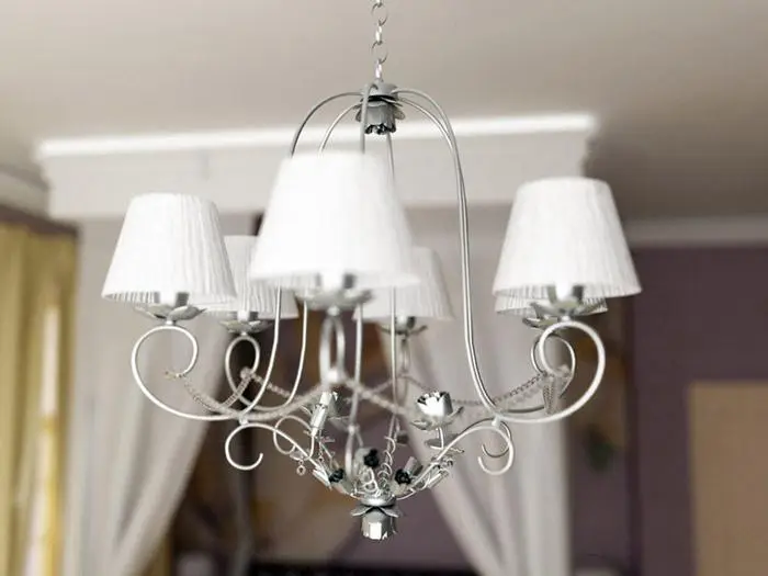 Стиль кантрі нагадує про спокійне сільське життя. Лампи, люстри, бра несуть додаткову декоративну навантаження. Вони підкреслюють натуральні матеріали, які використовують у відділці стін, стелі. Підбирайте абажури з тканини в малий візерунок або в клітинку.