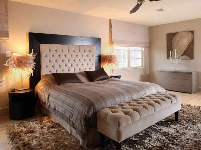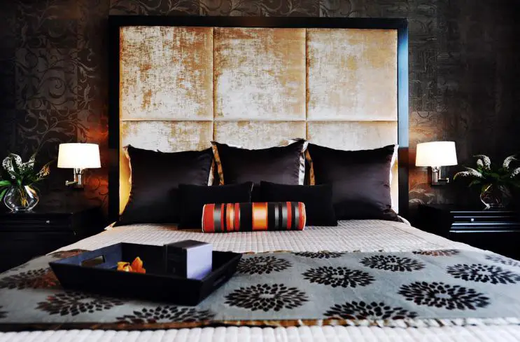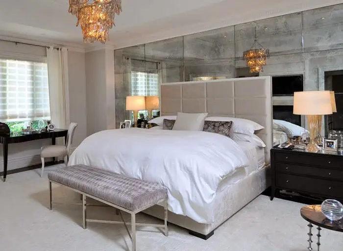 You can decorate the bed headboard with mirrored tiles, several small mirrors in ornate frames, or just one large mirror. If desired, you can even make the entire wall behind the bed mirrored.