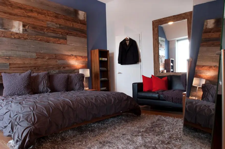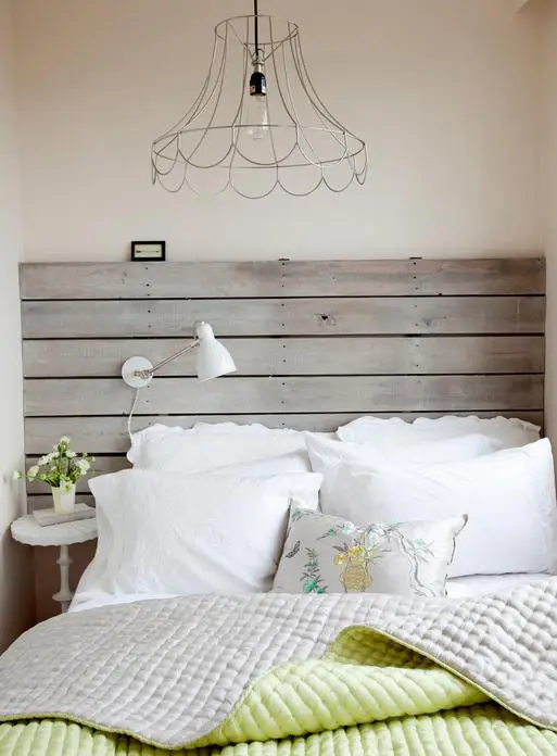 If your bedroom is decorated in Provence, country, or shabby chic style, you can use old door panels, shutters, or weathered boards as a bed headboard. New wooden panels can also become a stylish accent in almost any modern interior.