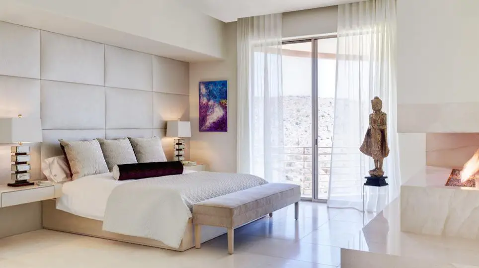 This is the most common way to style a bed headboard, creating a cozier atmosphere in the room. There is a vast selection of sizes, shapes, colors, and patterns—everyone can find something suitable. You can create a full accent wall behind the bed using fabric. This helps visually expand the bedroom.