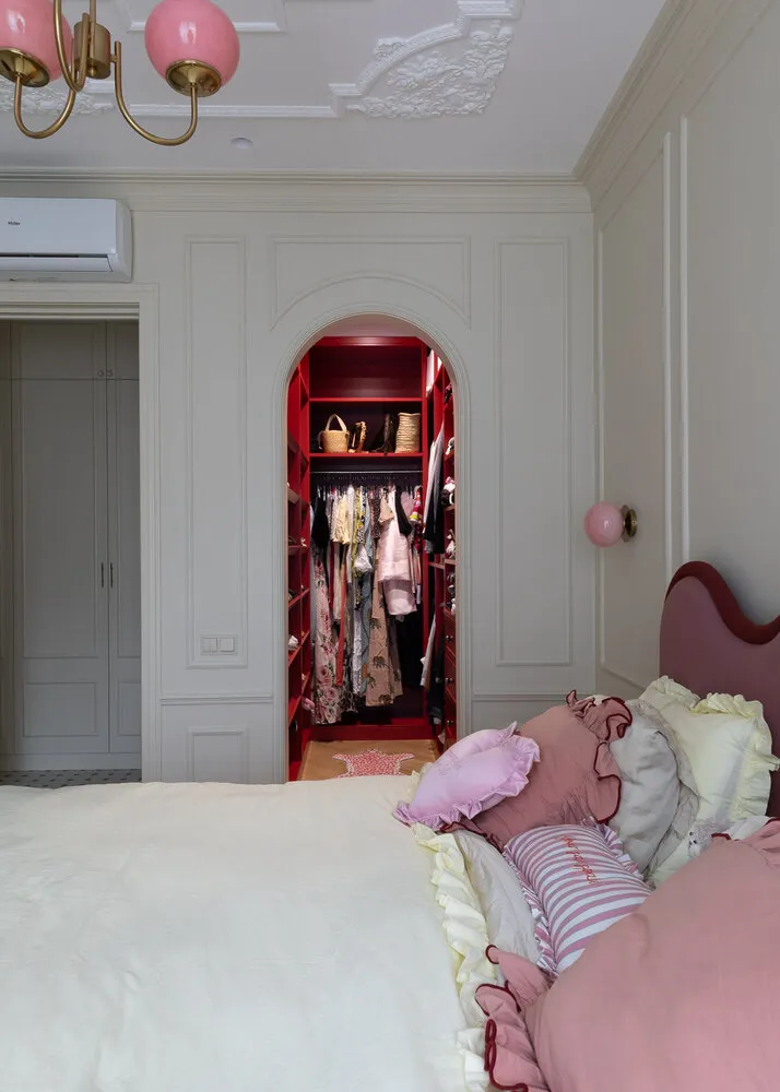 У спальні є окрема гардеробна, вхід у яку оформлено аркою. Для самої гардеробної я обрала червоний колір. Наповнення виконали на замовлення з МДФ і також пофарбували в червоний. У гардеробні передбачено різноманітне наповнення та підсвічування, затишно освітлюючи все, що знаходиться в шафах.