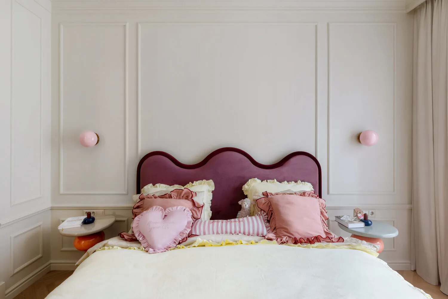 Хвиляста головка ліжка, прикрашена м'якою обшивкою і стильним орнаментом, стала яскравим акцентом у інтер'єрі та привертає увагу. Їй в тон підібрали ліхтарик і текстиль.