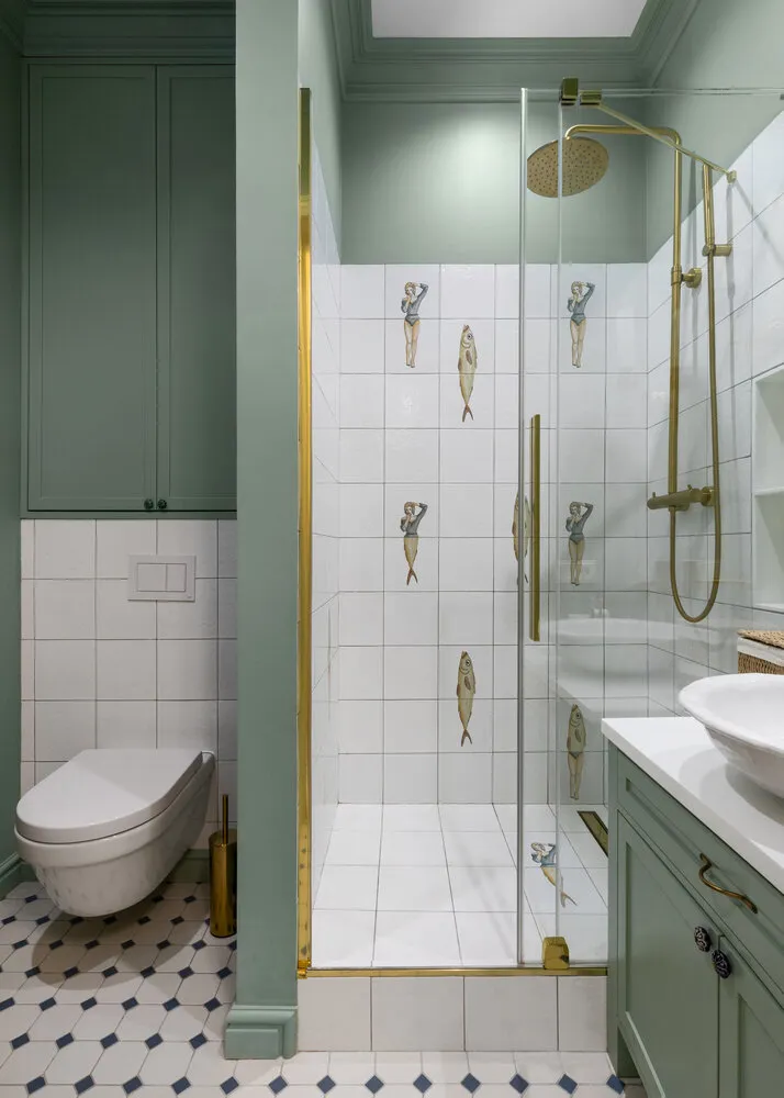 Санвузел став ще однією фішкою квартири: стіни душової оформлені білою плиткою з малюнком риб-русалок, а інші стіни пофарбували в глибокий блакитний колір. За допомогою латунної сантехніки та раковини-чаші додали елегантності. До речі, керамічна раковина виконана на замовлення однією художницею з Підмосков'я.