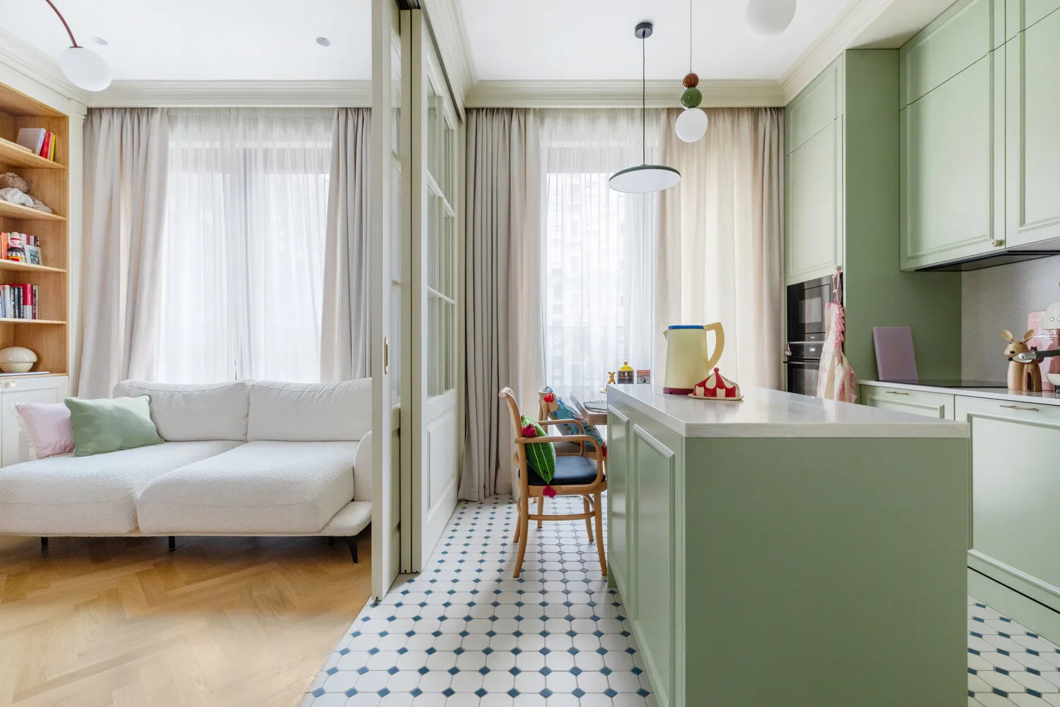 У цій невеличкій євродвушці живе молодва сім'я — блогер і оперна півниця Татьяна Борисова, її чоловік і їх пудель. Для оформлення простору вони звернулися до дизайн-студії «М-Бюро». Основою проекту стала любов господарки до кольору: вона віддає перевагу яскравим, але м’яким пастельним відтінкам, що нагадують палітрі макарунів. Саме ця особливість визначила характер інтер'єру, про який нам детально розповіла Татьяна.