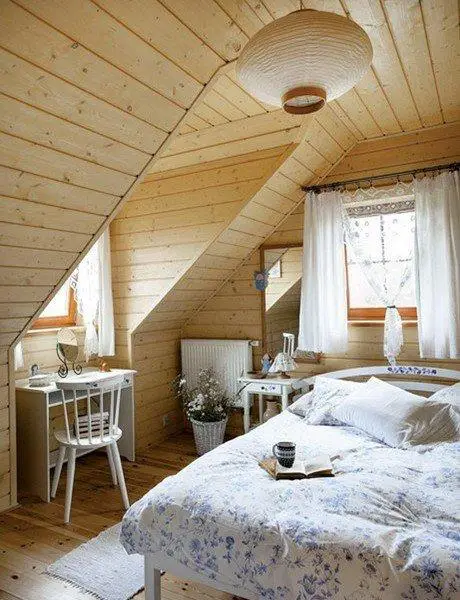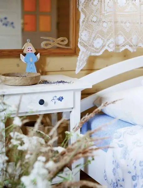 На другому мансардному поверсі будинку розташована головна спальня. Вона, як і весь будинок, багата на комбінацію дерева, білого кольору та малюнків, що нагадують гжель. А ще в усіх місцях є або свіжі квіти, або засушені ароматні трави.