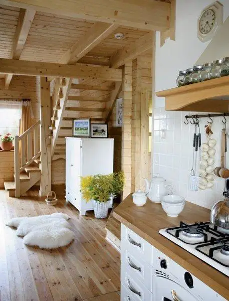 Усередині будинку більшість меблів також була зроблена на замовлення з дерева. І вони чудово поєднуються зі світлим деревом підлоги, стін і стелі. Інша частина меблів або пофарбована в білий колір, або їм відповідають білосніжні штори, скатертини та інший текстиль. А ще білим фоном відзначається кухня, об’єднана зі зонами гостинної та столової.