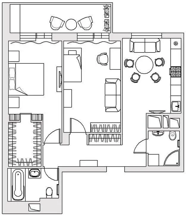 Вихід на балкон є з обох кімнат квартири, тому було важливо зробити його продовженням інтер’єру, а не місцем для зберігання непотрібних речей. З боку спальні ми прибрали підоконний блок і зробили французьке вікно з розсувними дверима, таким чином, в спальні стало світліше. Після утеплення балкон став трохи вужчим, але це була необхідна міра для подальшого комфортного перебування на ньому.