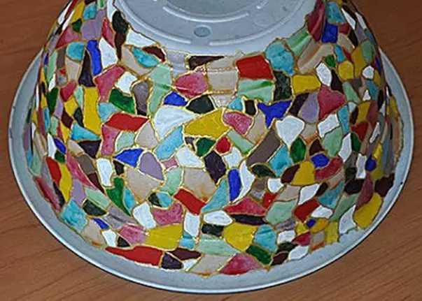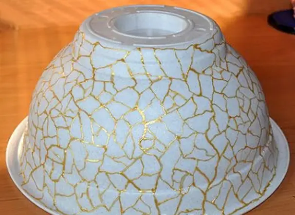 Зробити це можна так, як вам заманеться, бажаєте, зобразити героїв казки. Хочете – намалювати волшебний ліс або абстракцію. Все залежить від ваших бажань і фантазії. Ми обрали мозаїку. Для цього золотим контуром нанесли довільні клітинки-лінії.