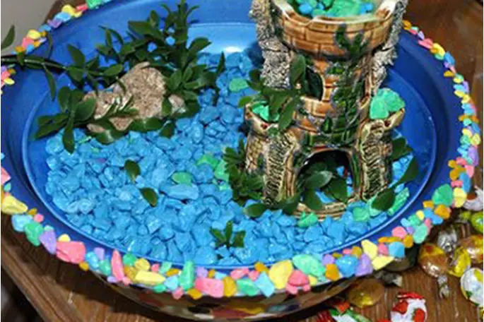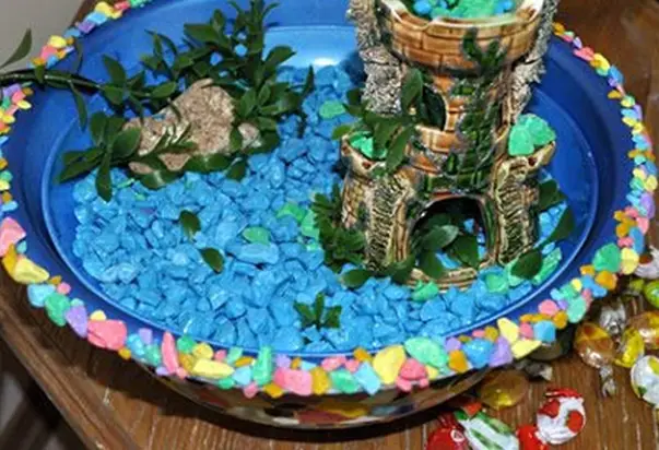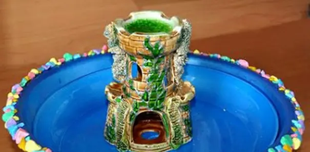 Всі заготовки готові, можна збирати фонтан. Трубку, що подає воду, пропустіть через віконце замка. Дна засипьте каменями для акваріуму. Розкладіть штучні водорості, рослини. І можете включати фонтан! Ось таке чудо для релаксації можна зробити власноруч. Звісно, це може бути приємним подарунком!