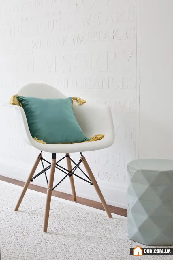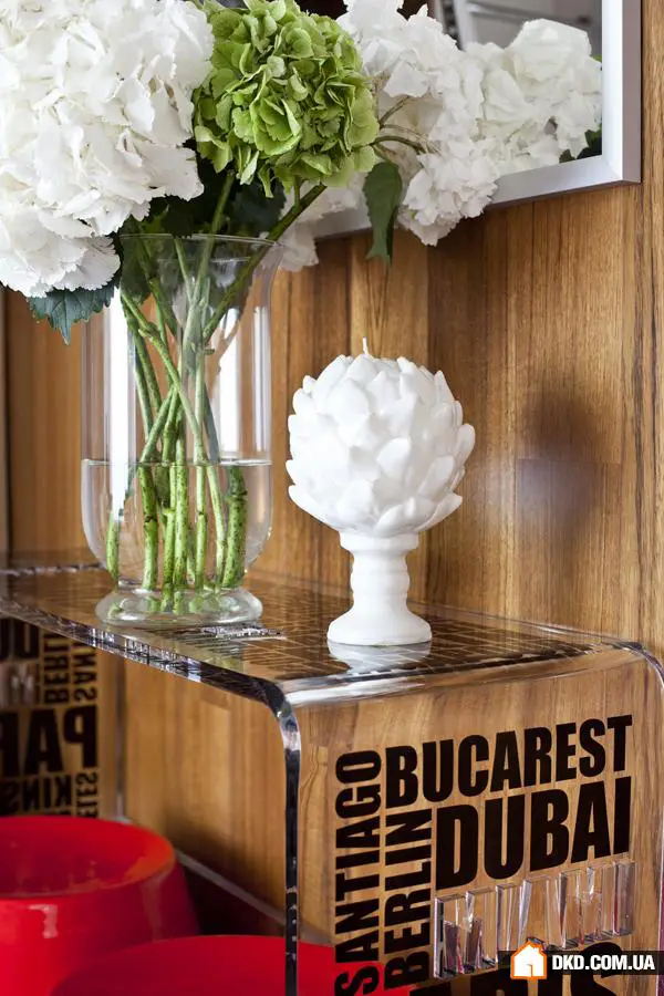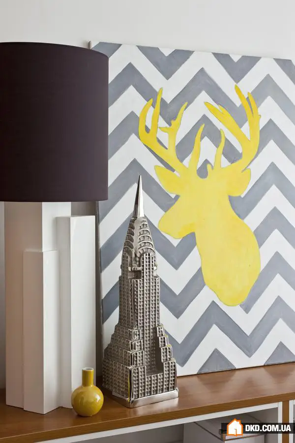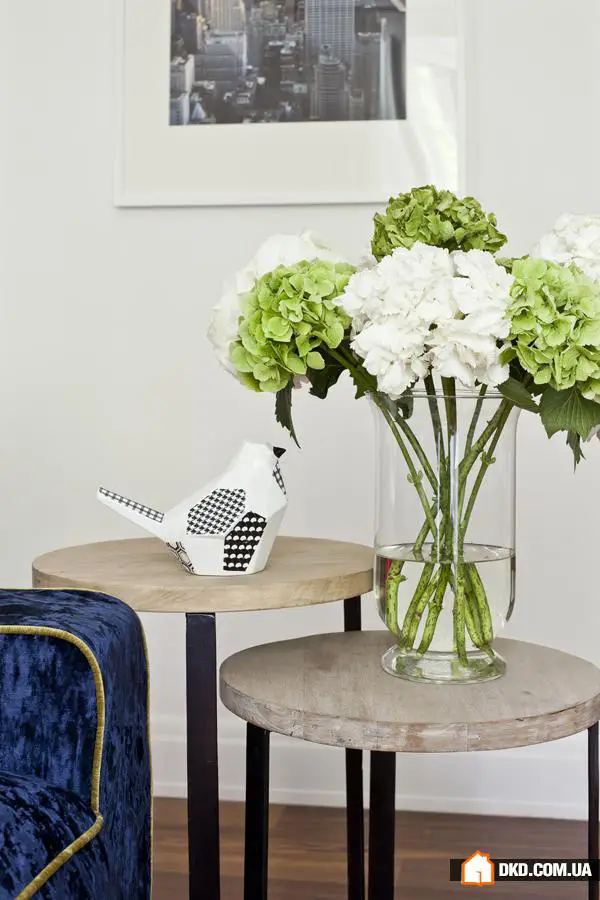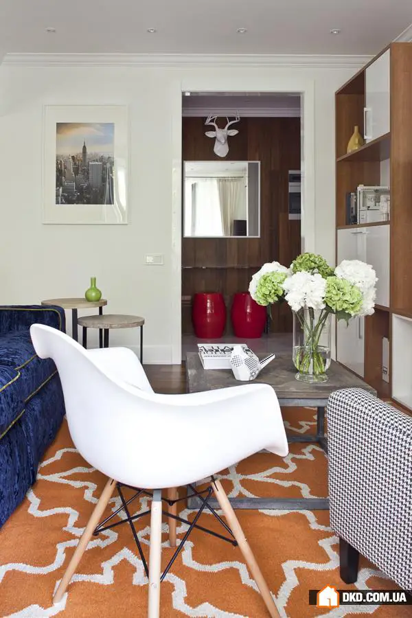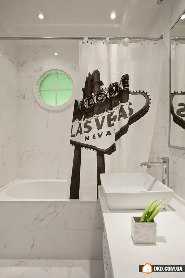 Інтер'єр цієї світлої двокімнатної квартири одразу видає своїх власників — це молодий прогресивний пара, яка любить світлі відтінки та сучасні ідеї. Також вони мають особливу схильність до Нью-Йорку, тому перед дизайнером стояла задача внести американські мотиви в інтер'єр. Білий був обраний як основа, при цьому загальна картинка була розбавлена великим числом активних кольорових акцентів. Серед цікавих рішень можна виділити кругле світлове вікно у ванній, дзеркала для візуального розширення не надто великої спальні, шторка з густого бархату замість дверцят у одного з шаф. Але справжньою ізюмінкою квартири став гімн сім'ї на стіні у спальні — у вигляді об'ємного панно про любов, радість та щастя.