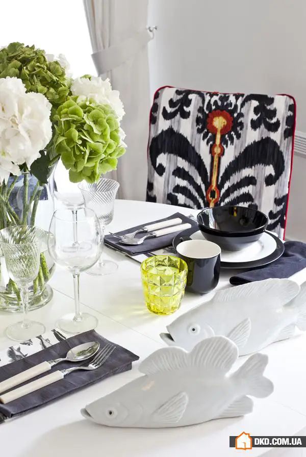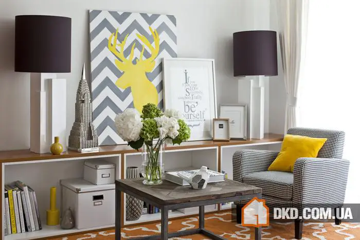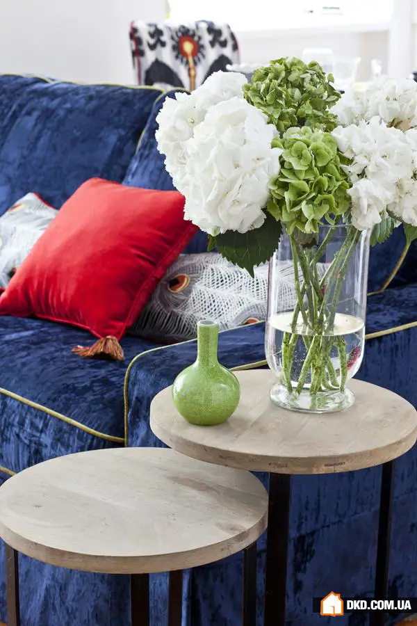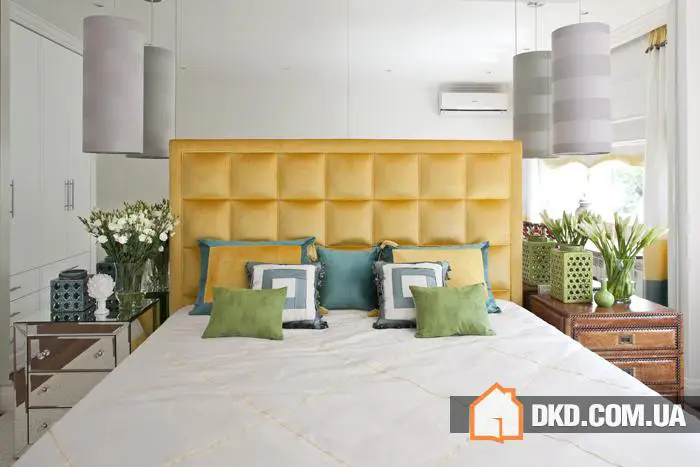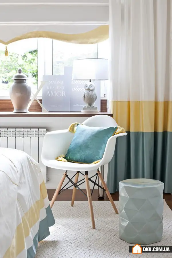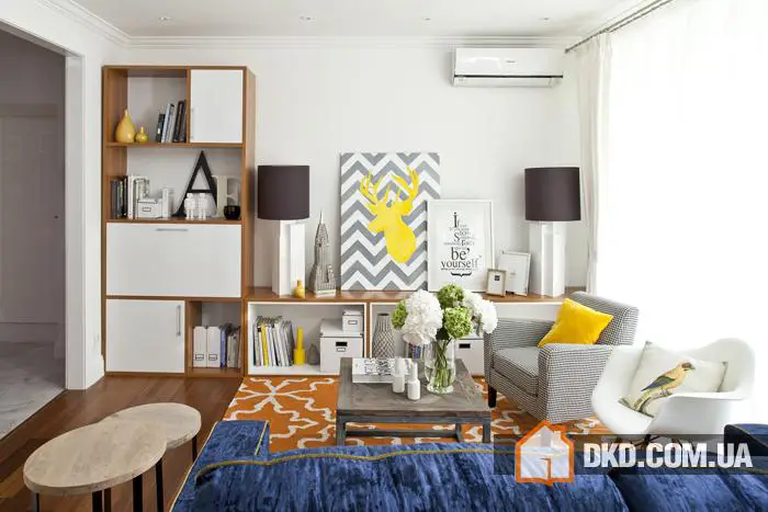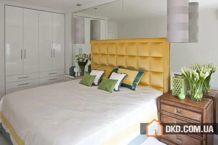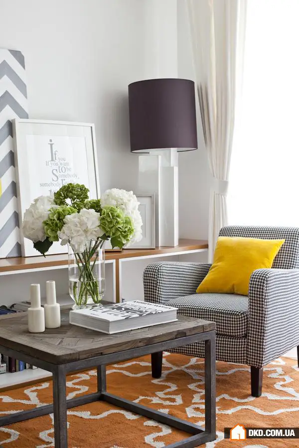 Інтер'єр цієї світлої двокімнатної квартири одразу видає своїх власників — це молодий прогресивний пара, яка любить світлі відтінки та сучасні ідеї. Також вони мають особливу схильність до Нью-Йорку, тому перед дизайнером стояла задача внести американські мотиви в інтер'єр. Білий був обраний як основа, при цьому загальна картинка була розбавлена великим числом активних кольорових акцентів. Серед цікавих рішень можна виділити кругле світлове вікно у ванній, дзеркала для візуального розширення не надто великої спальні, шторка з густого бархату замість дверцят у одного з шаф. Але справжньою ізюмінкою квартири став гімн сім'ї на стіні у спальні — у вигляді об'ємного панно про любов, радість та щастя.