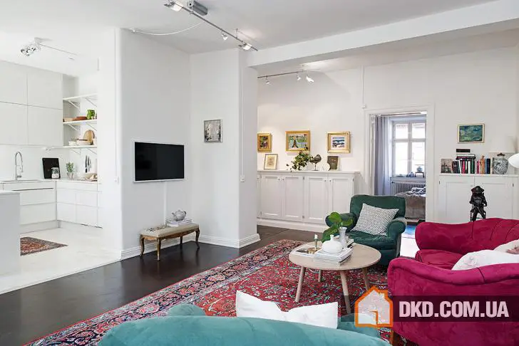 Чудова квартира площею 87 кв. метрів розташована на останньому поверсі житлового будинку з видом на центр Гетеборга, Швейція. Вона має дві спальні, ванну кімнату та простору гостину, з’єднану з кухнею. Квартира розташована у куті, тому вікна виходять у дві сторони, що забезпечує об'ємне освітлення приміщень. Унікальні архітектурні особливості будинку відразу привертають увагу. Це мансардні вікна, цегельна кладка та дерев’яні стельові і вертикальні балки, фарбовані в коричневий колір для контрасту з білою обшивкою стін і стелі. Декор квартири виконаний у скандинавському стилі, де домінують простота і затишок.