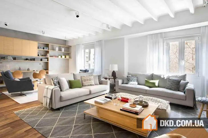 Всередині, у інтер'єрі, гра контрастних чорних, сірих, жовтих і бежевих відтінків доповнюється грою світла і тіней і блиском металу, використаного в облицюванні. Дизайнер чудово поїграв із дзеркалами, у деяких кімнатах здається, що вікон ще більше, хоча, без сумніву, у цьому квартирі панорамних вікон і так достатньо. Незважаючи на здавалася однообразність у кольорах і облицюванні, у квартирі дуже затишно — тут своє діло зробили свічки, камін, квіти в вазах, теплий світло ламп і сонячні акценти в декорі. Чудовий мікс урбанізму і атмосфери сільського дому: з каміном, терасою, барбекю і надлишком світла в кожній кімнаті.