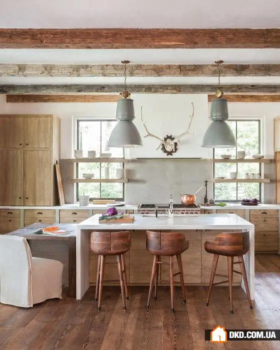 Цей вражаючий будинок у горах штату Північна Кароліна є чудовим прикладом перетворення старого сараю на дуже сучасне місце життя родини. Кухня досить проста, меблі з білого дубу поєднуються з дерев'яним підлогом, альбоми вироблені з мінімалістичним дизайном. Дуже оригінально виглядають полиці на вікнах, крім іншого, вони додають місця для посуду. Масивними елементами є великі старовинні промислові ліхтарі, які освітлюють острів із трьома дерев'яними табуретами. Інтер'єр спальне кімнати вийшов умиротвореним і гармонійним завдяки правильно підбраним текстурам і м'яким природним тонам, які контрастують із темними промисловими елементами. Інтер'єр вражає!