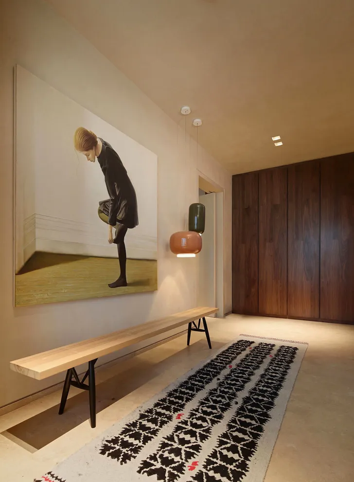 Не хочеться стояти чи сидіти на місці, коли навколо така суета. Схід набуває нових відтінків, і їх палітра реалізована в цьому інтер'єрі. Багато динамічних принтів («ялинка», ромб, смуги, горошини білі на чорному фоні) будоржать зір, а отже, і розум. Блукання очей переходять на картини – там повністю руху – ноги, переливи кольорів, цвітіння сакури. Всюди життя, рух, активність, енергія, зміни. Класичні портрети набувають нового дихання, це вже не статика.