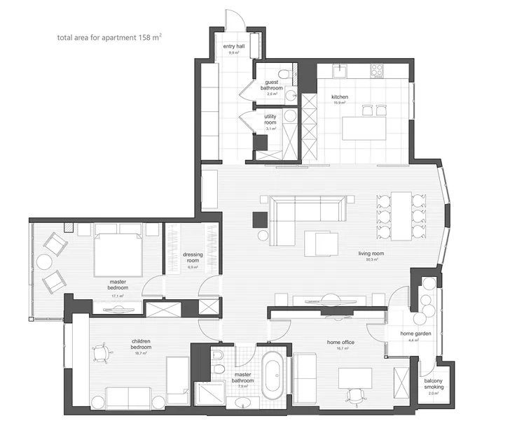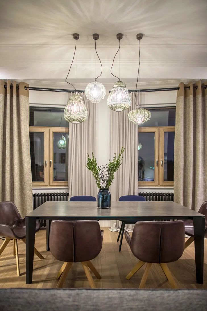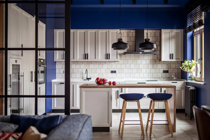 Ось що означає вдале використання великого простору! У цій просторній квартирі площею 153 кв. м в Києві, здається, все заплановано та розподілено ідеально: відкрита гостьова кімната площею 50 кв. м з обідньою зоною, кухня, символічно розділена скляною перегородженою, господарська спальня з лаунж-зоною біля вікна, дитяча кімната та великий кабінет. Загалом, інтер'єр вийшов дуже світлим, що зумовлено великими вікнами та білим кольором у базовому оформленні. Дуже приємний сучасний інтер'єр великого міста!