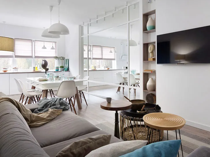 Загальна зона, у яку увійшли кухня, столова та гостьова, починається з довгого зигзагоподібного світлового пояса на стелі, який візуально робить кімнату глибше. Цей зигзаг, як пароль дому, приховує у своєму вигині світло та створює бажання досліджувати простір квартири.