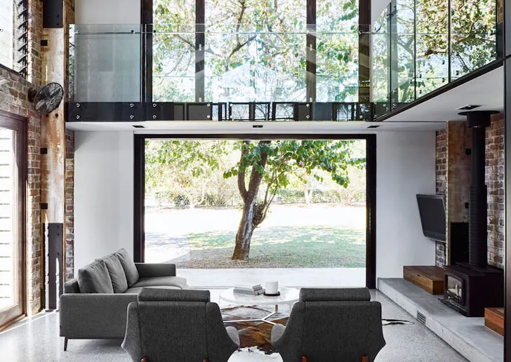 Центральною зоною загальної зони є кухонний острів. Мармурні робочі поверхні, приховані за дерев'яними панелями шафи для зберігання та синя скляна вітрини створюють діалог між різними фактурами.