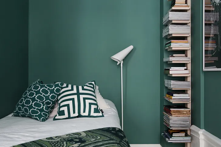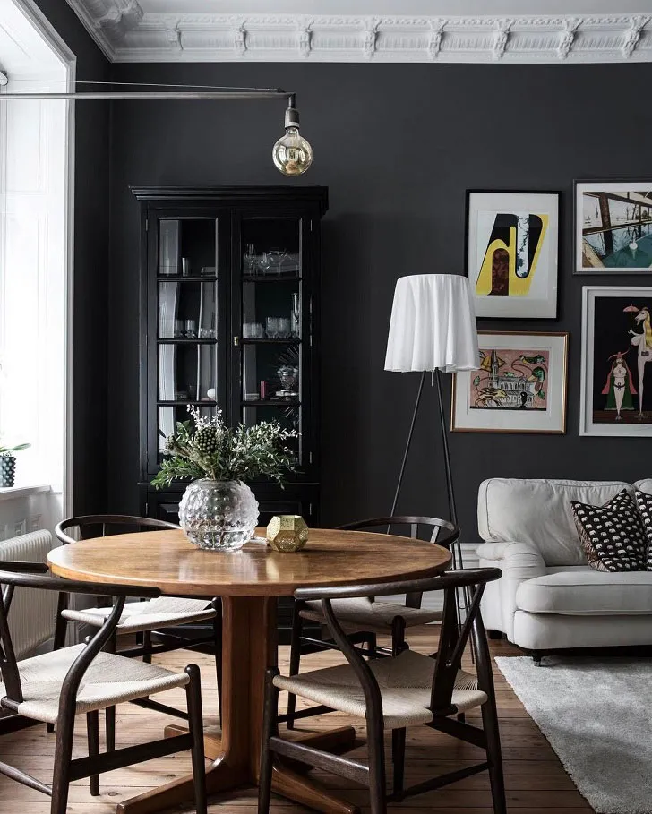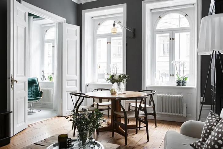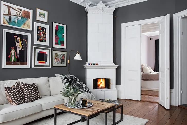 Білий використовували в меблях, а чорний — як акцент. Гостину вирізняє контрастна пара: чудовою білою піч початку 20-го століття і колаж із яскравих сучасних картин на темних стінах. Така кольорова палітра дуже пасує до цього місця, головне — не переборщити з шторами — коли стіни в квартирі темні, у кімнаті має поступатися максимум природного світла.