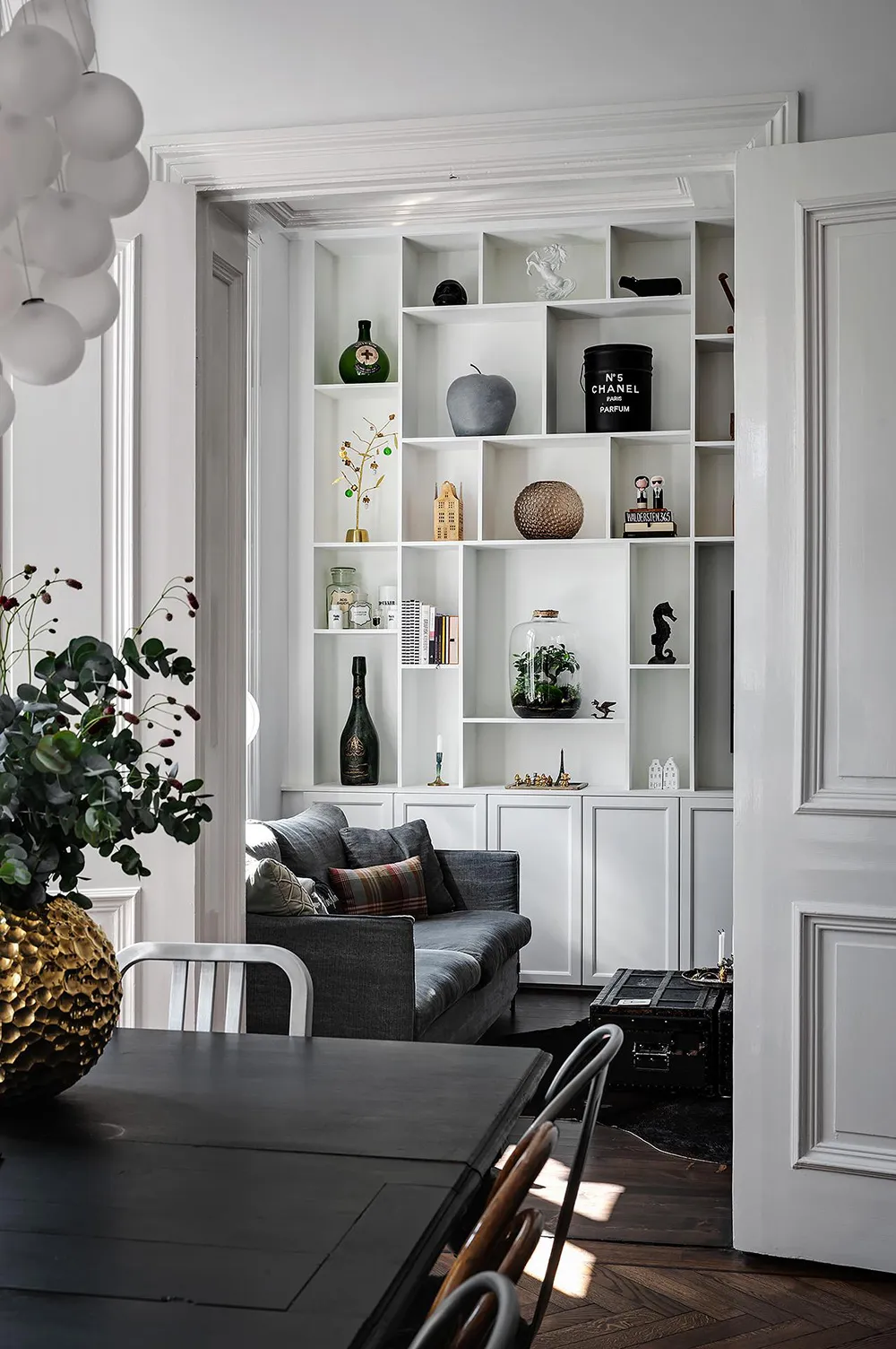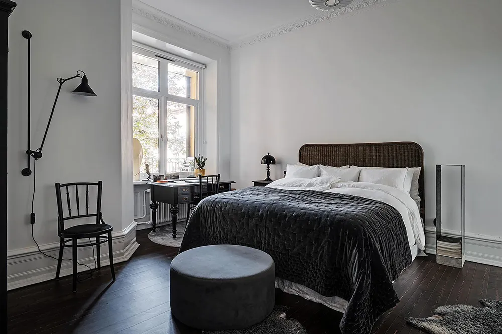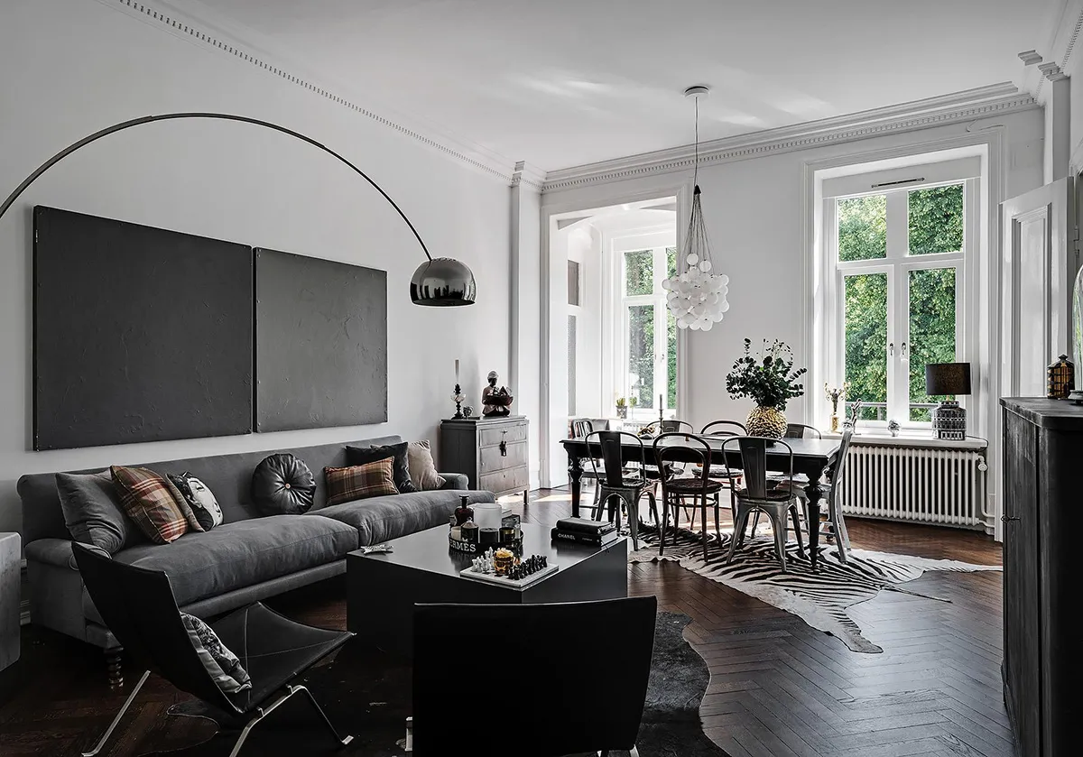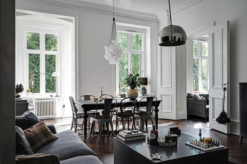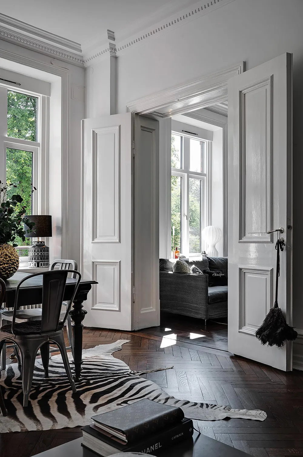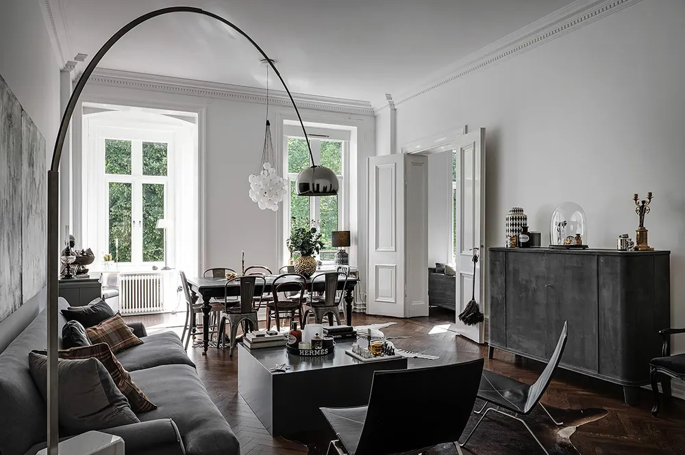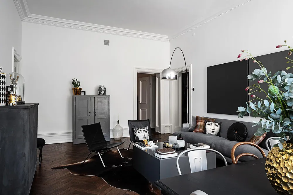 Ця шведська квартира атмосферою нагадує стильні апартаменти Парижа або Лондона — строга чорно-біла колористика надала класичному простору з молдингами та французьким паркетом сучасної елегантності.