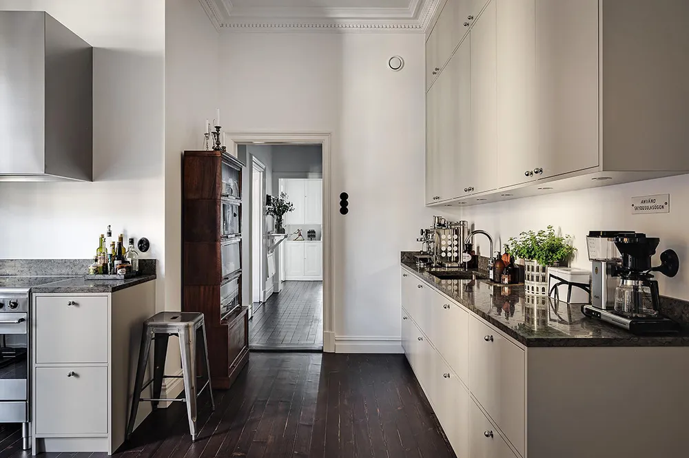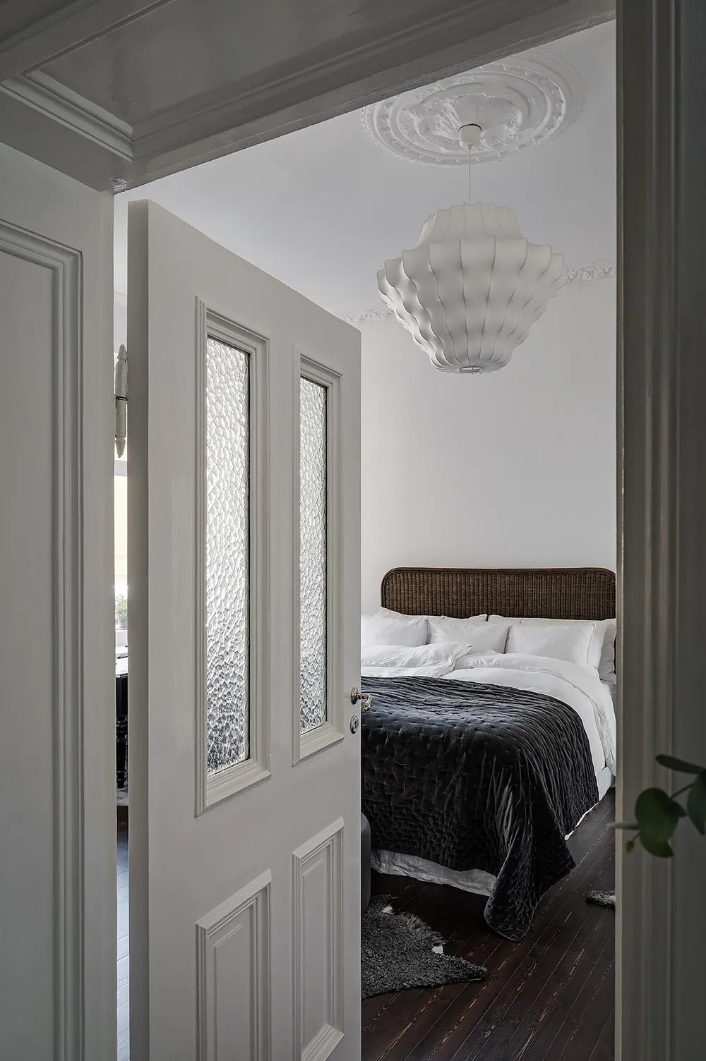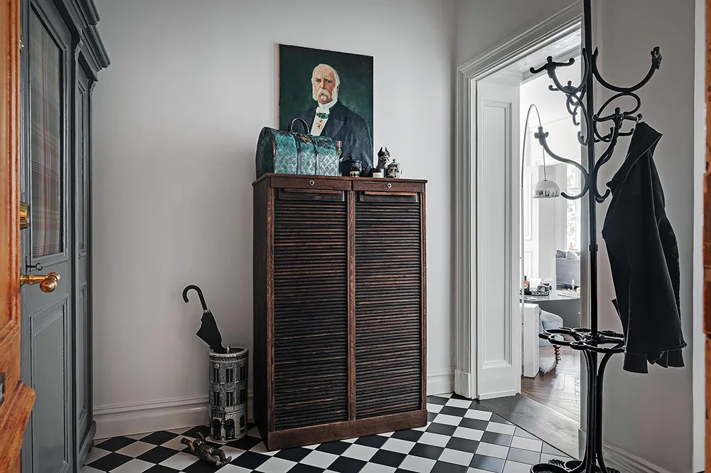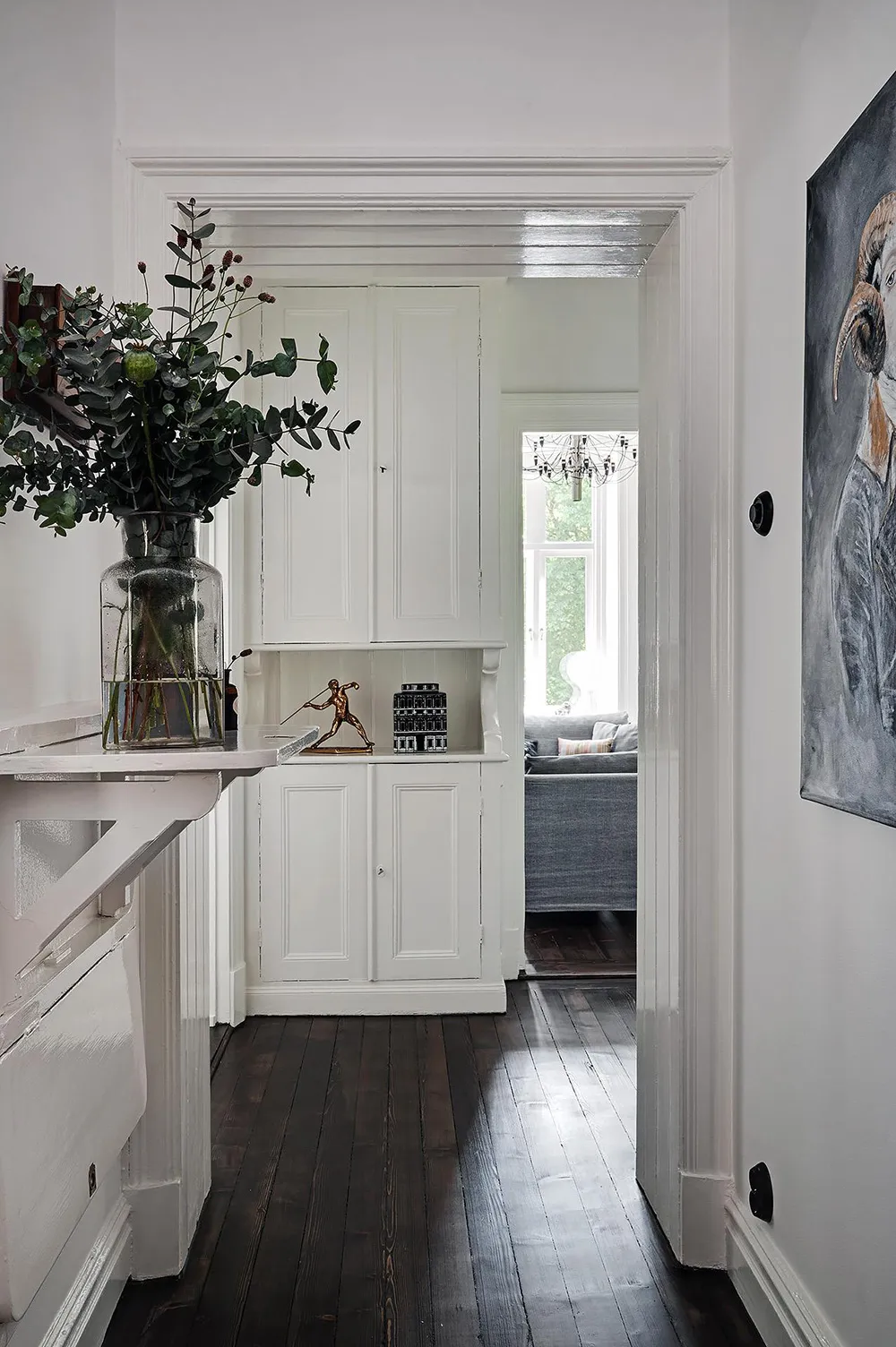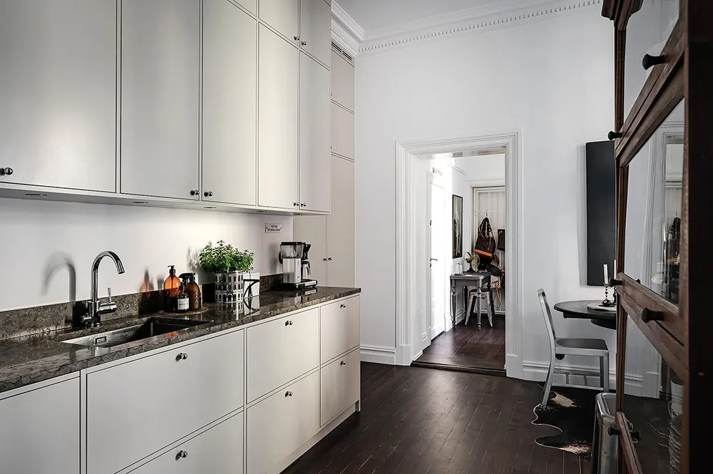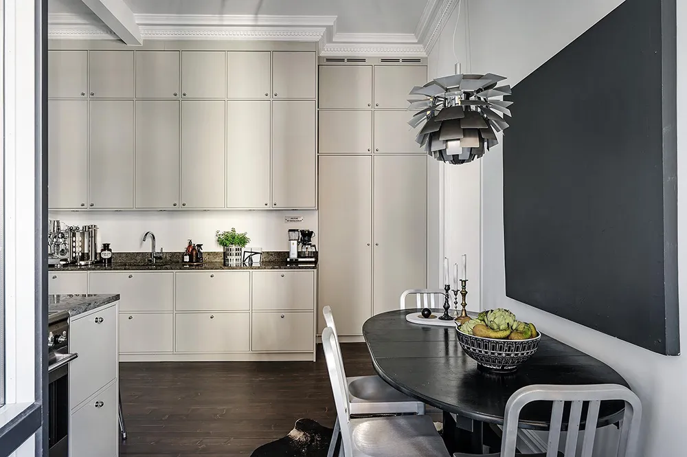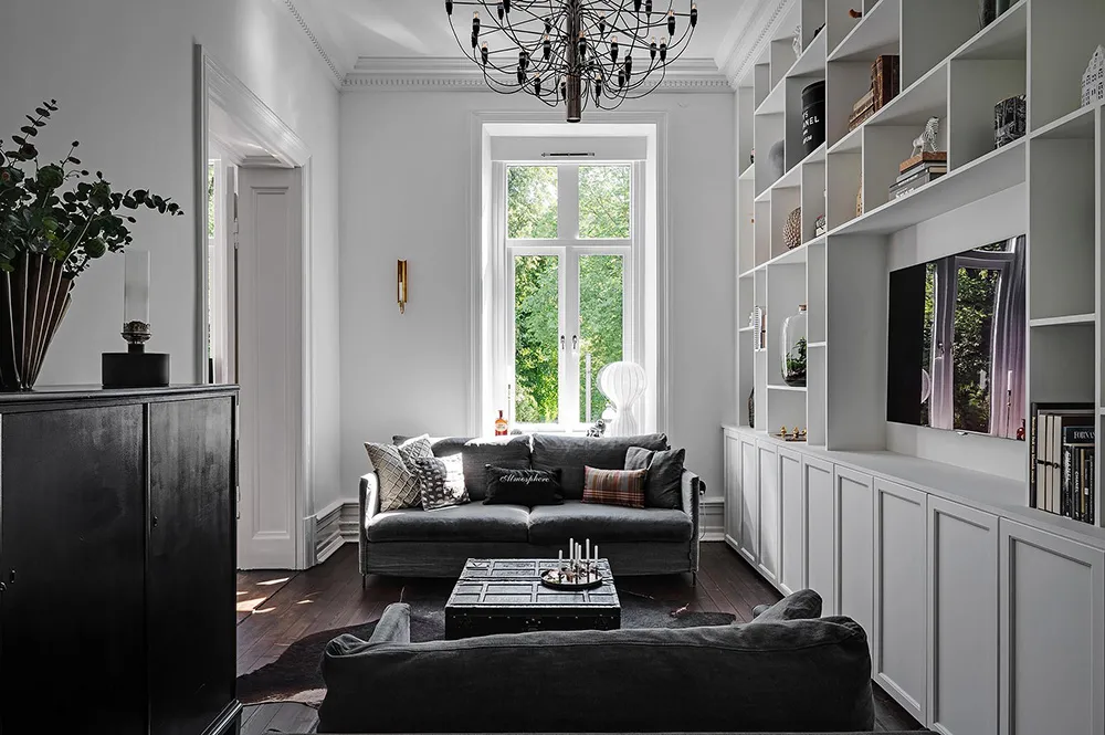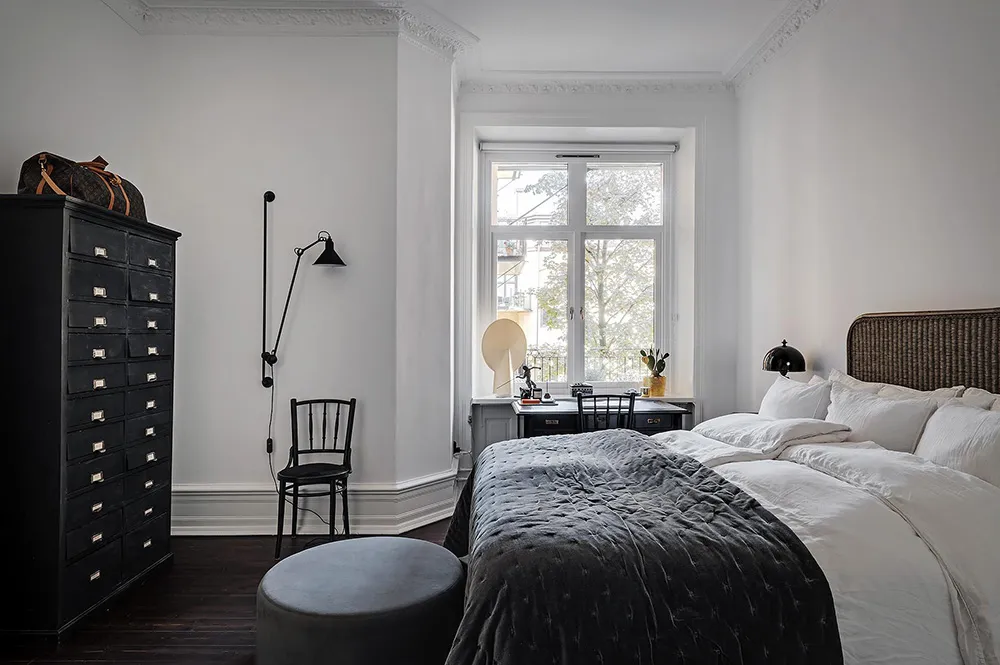 Ця шведська квартира атмосферою нагадує стильні апартаменти Парижа або Лондона — строга чорно-біла колористика надала класичному простору з молдингами та французьким паркетом сучасної елегантності.
