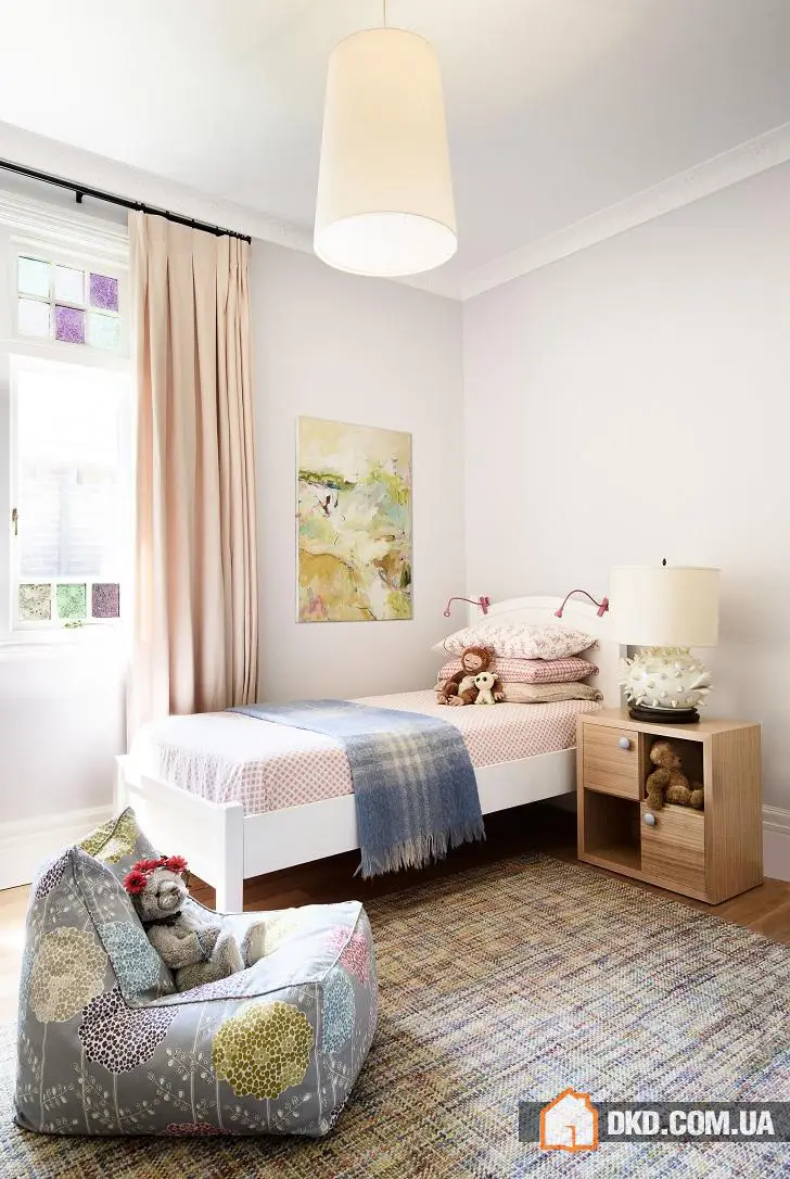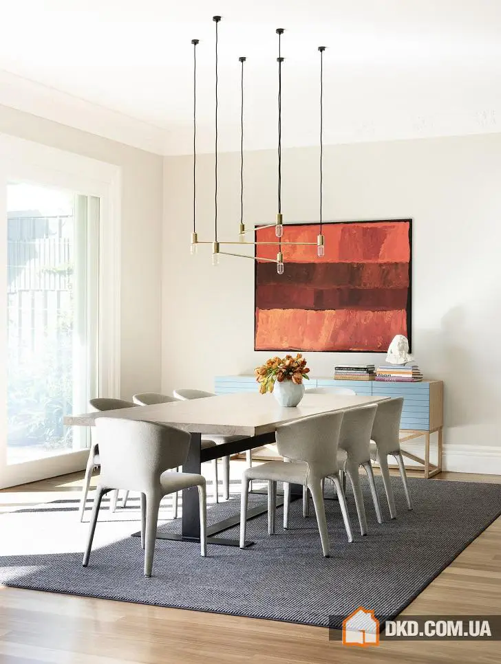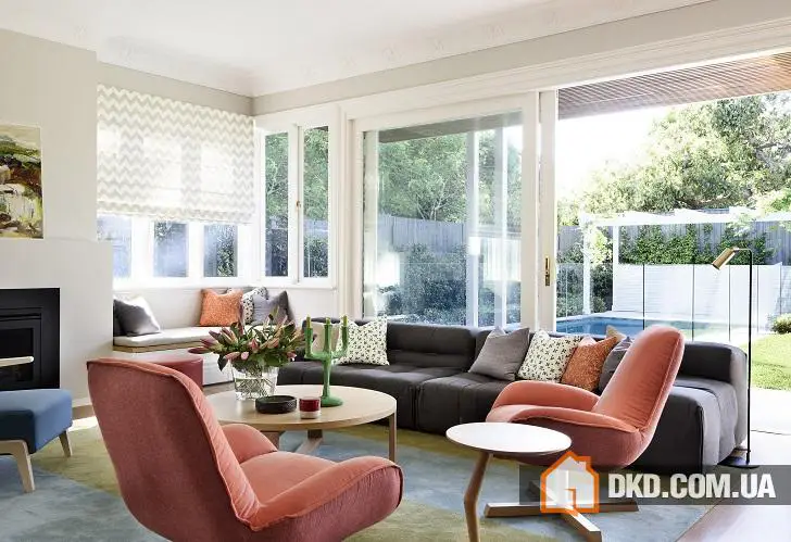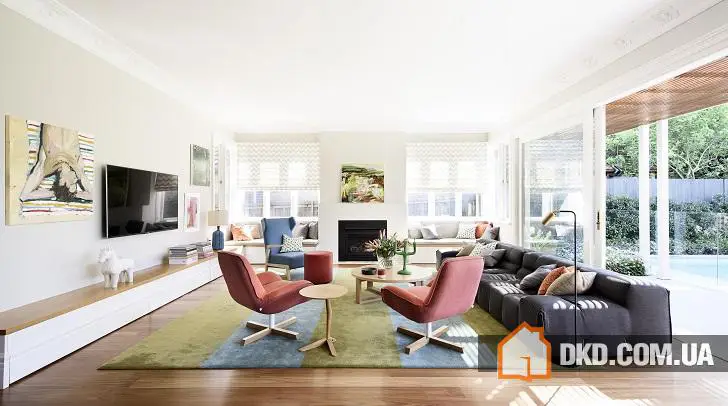 Кольорова палітра інтер'єру цього дому в Австралії майстерним поєднанням відтінків нагадує твори художників-імпресіоністів. На тлі світилих стін, стель і підлоги яскрава меблі, картини та предмети декору виглядають просто фантастично. Кольорова палітра підібрана настільки тонко, що ти наче розчиняєшся в цьому просторі, насолоджуючись кожним "мазком", блиском, кожною деталлю. Особливе згадування вартий вітражі, які роблять цей дім справжнім чарівним, наче такі вікна ми вже не раз бачили в ілюстраціях до казок. Якщо говорити про конкретику, то дизайн меблів тут явно навіяний зразками 60-70-х років минулого століття, а загальна стилістика витягнута зі стилів котемпорарі та скандинавського стилю. Однак це все лише джерела вдихнення, весь цей інтер'єр загалом неймовірно оригінальний як за кольорами та фактурами, так і за загальною атмосферою душевної гармонії та життєвої енергії.
