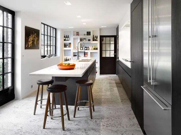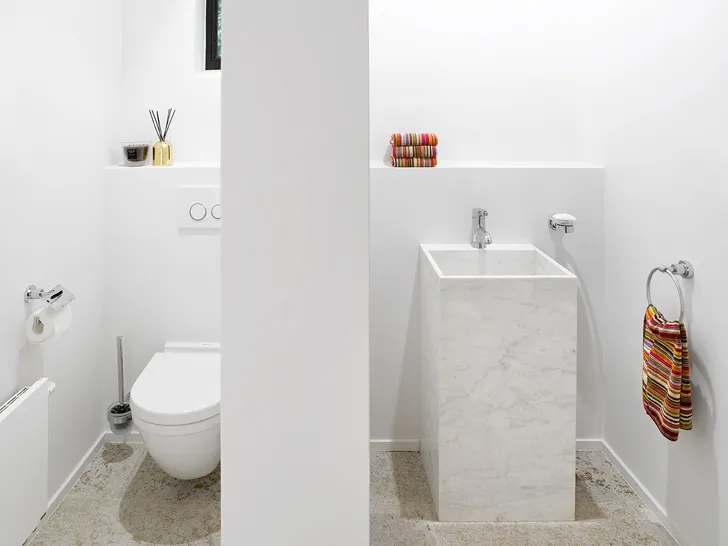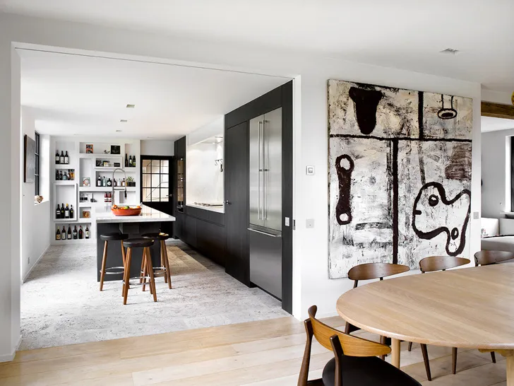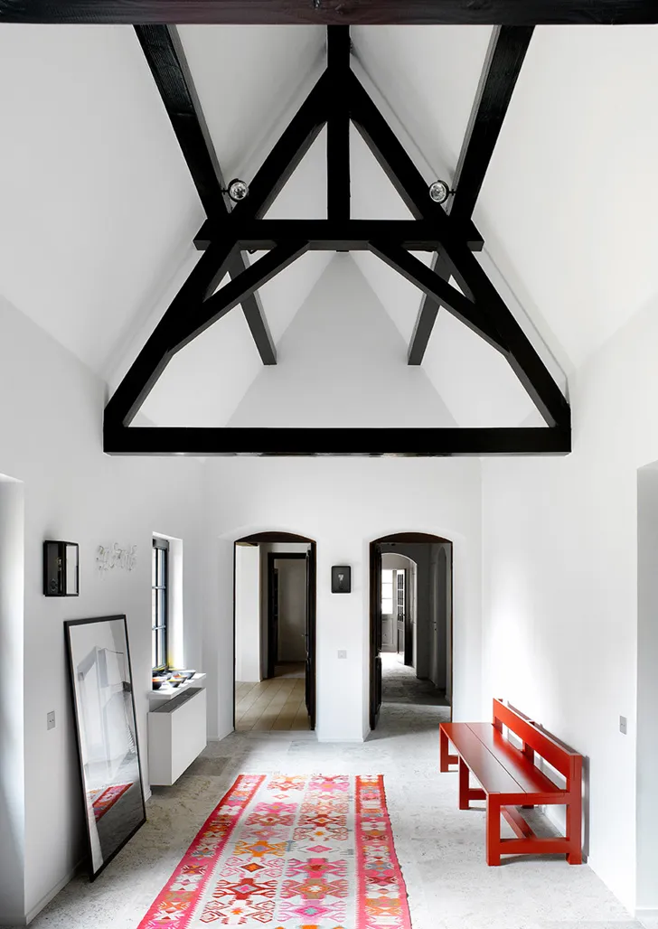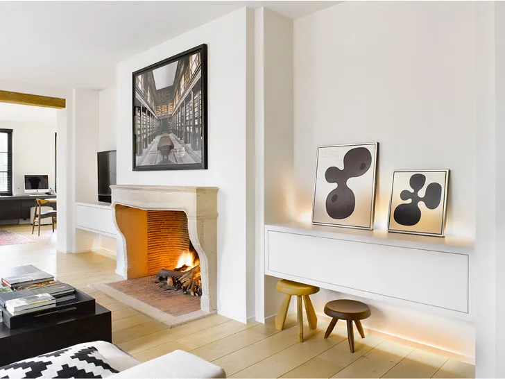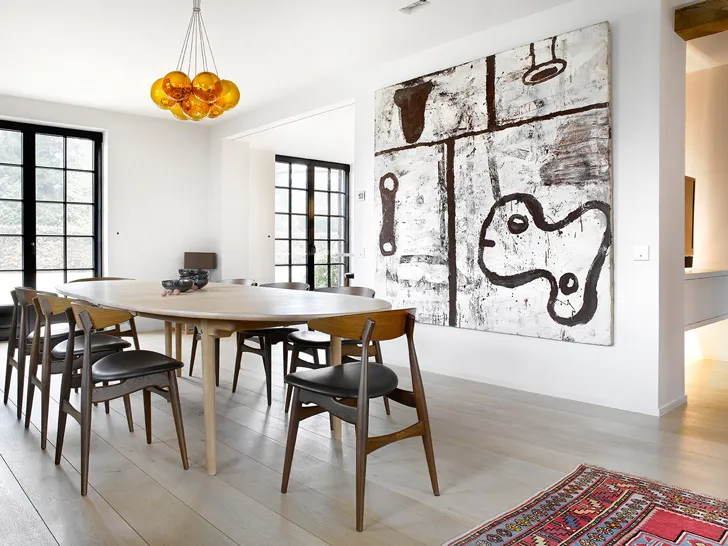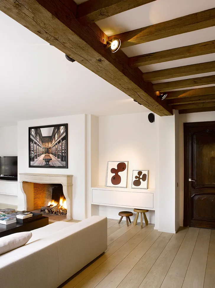 Цей світлий будинок у Брюгзі був би холодним і порожнім без деяких елементів декору та оздоблення. Наприклад, дерев'яні стельові балки — з ними гостьова відразу перетворилася на більш затишне та тепле місце. Відкритий камін також внесв свій вклад у створення затишної атмосфери в будинку. Ще раз переконуємось, що гармонічний дизайн — це вміле поєднання різних стилів і напрямків у дизайні!
