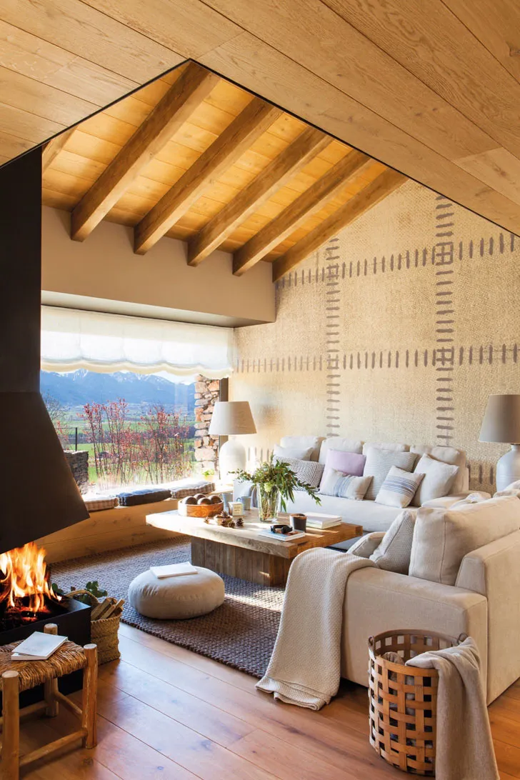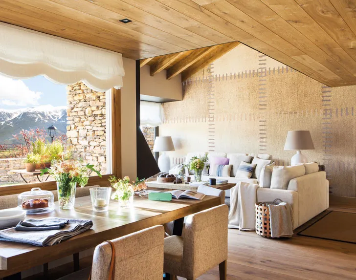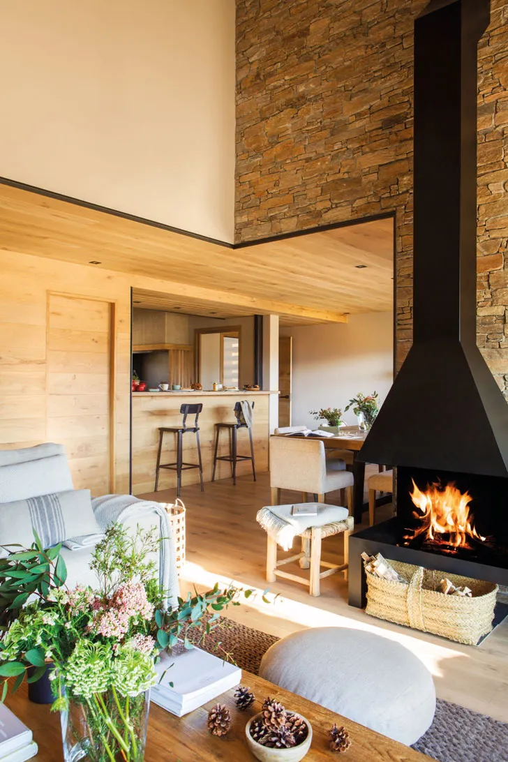 У цьому гірському будинку мешканці, напевно, відчувають себе як у особистому кінотеатрі, де ролю екрана грає велика скляна стіна, а фільми показує сама природа. Телевізор тут був би зайвим, адже від виглядів за вікном важко відірвати погляд. Хоча зазвичай у таких випадках увагу зосереджують на панорамних видовиках, а інтер'єри ніби не заважають, у цьому будинку з декором все дуже добре: оригінальні текстури та натуральні матеріали чудово поєднуються з сучасним мебллю та строгими лініями. Чудово!