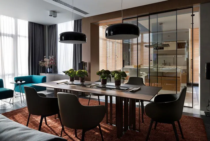 Інтер’єр також був продуманий до мінімального деталі. По всьому будинку використовується світлий дерев’яний підлога, за винятком балконів, які відрізняються яскраво-коричневим деревом. Колірна палітра виконана у білій і сірій палітрі — від темно-сірого великого дивана у гостьовій кімнаті до білих і сірих кухонних стільців, темно-сірого кахляного підлоги з рисунком у вигляді ялинки у ванній кімнаті — і акцентована мебллю з дерева та нержавіючої сталі на кухні і лестничному приміщенні. Стекло — інша текстура, яка характеризує інтер’єр будинку. Прозорі перегородки відокремлюють кімнати одна від одної, одночасно зберігаючи відкриту планування і залишаючи первинну схему приміщень будинку незмінною.