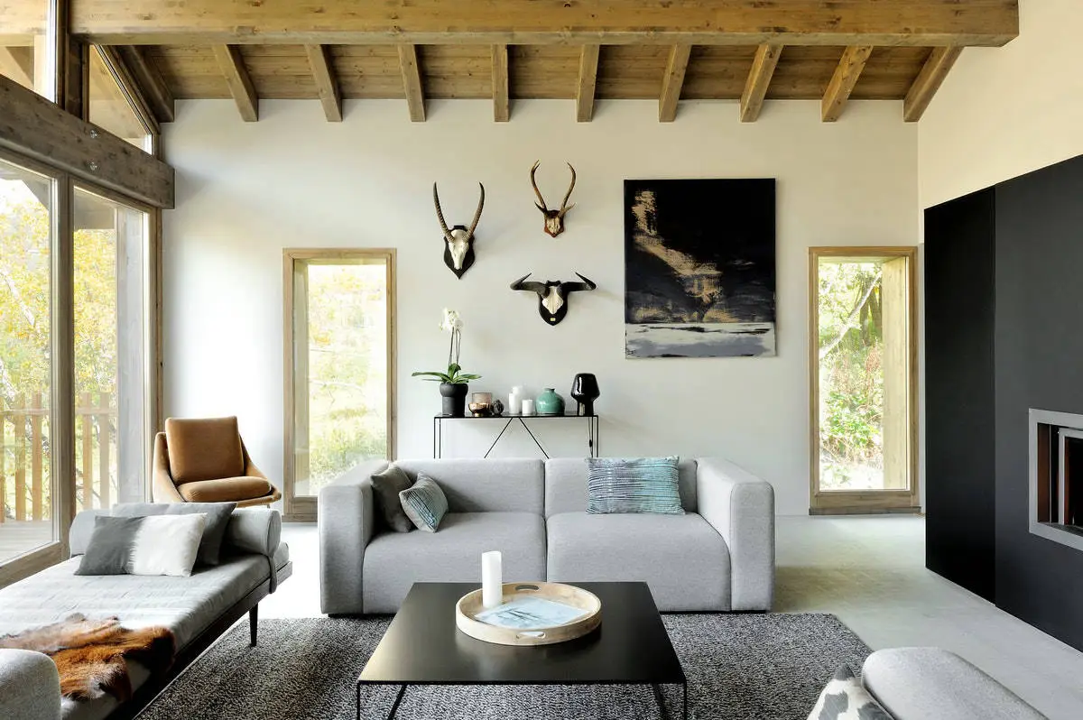 Чудовим прикрасою гостьової кімнати є камін, облицьований мрамором золотистого відтінку. Зона столової розташована біля вікна. Автори проекту намірено відмовилися в цьому місці від штор, щоб відкрити панорамний вигляд на внутрішній двір. Лаконічна та функціональна кухня відокремлена системою розсувних панелей, які відбивають світло. Поруч є зручна зона для сніданку, яка стала улюбленим місцем замовника.