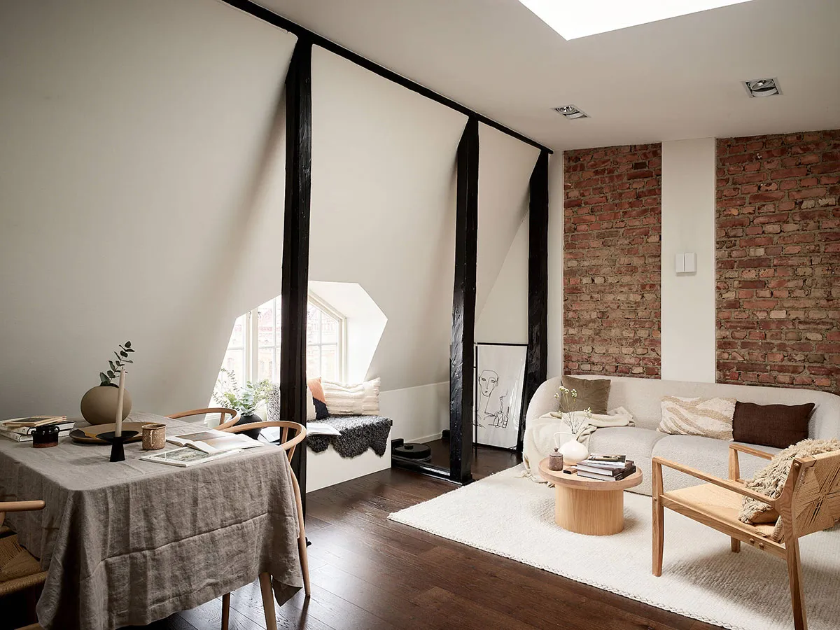 Скошені стеля, цегляна стіна і гардеробна кімната: цікава мансарда в Швеції (42 кв. м)