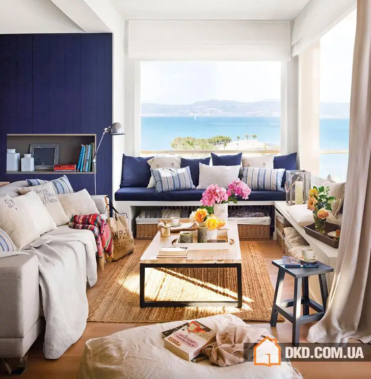 Основа цього інтер'єру — пастельні відтінки, світле дерево та мотиви пляжу і моря. Будинок нагадує пляжний будинок, де так приємно відпочити від південного зною. Найбільше тут бежевого і блакитного, кольори, що відповідають піску і морській воді. Вся меблі та облицювання виконано зовсім з природних матеріалів: дерево, камінь, лляна тканина. Але основна обстановка — лише половина справи, атмосфера легкості і затишку цьому інтер'єру надають саме деталі: малюнки, дзеркала, лампи з скляним підставкою, ракушки, сундуки, подушки, кошики. До речі, варто запам'ятати використання в декорі сухих гілок, олив і плодів артишока — такі аксесуари прослужать вам багато місяців. Дуже гармонійний і ніжний інтер'єр, у такому будинку буде затишно навіть коли за вікном непогода.