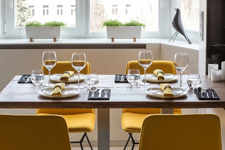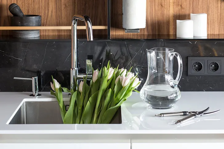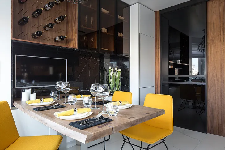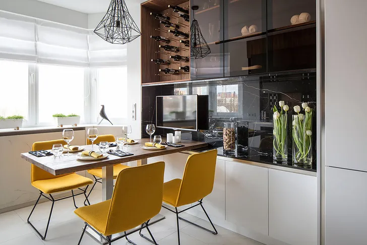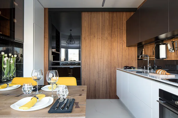 Чорно-білі фасади, дерев'яні елементи та жовтий як акцент — ось успішна формула дизайну цієї чудової сучасної кухні в одному з московських новобудів. Це саме той випадок, коли функціональність і естетика мінімалістичного інтер'єру ідеально поєдналися в одному дуже гармонійному і не дуже великому просторі. Чудово!