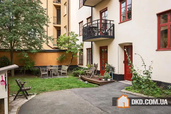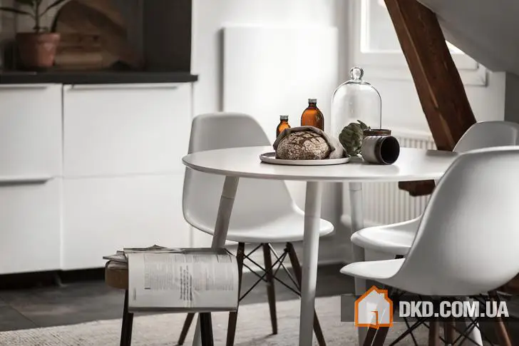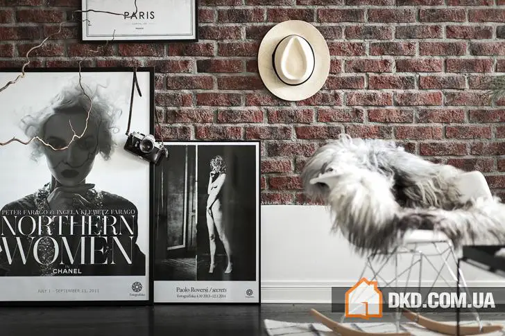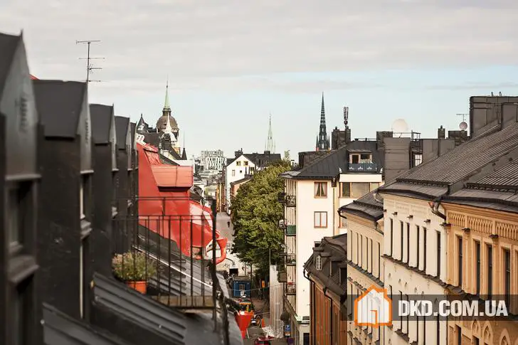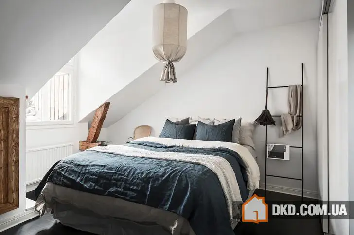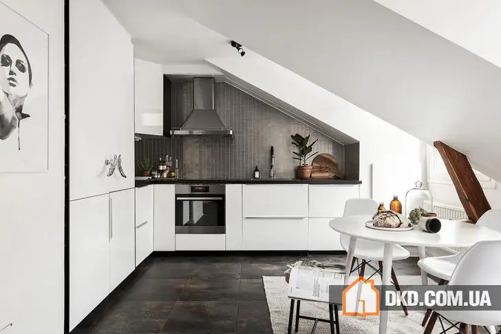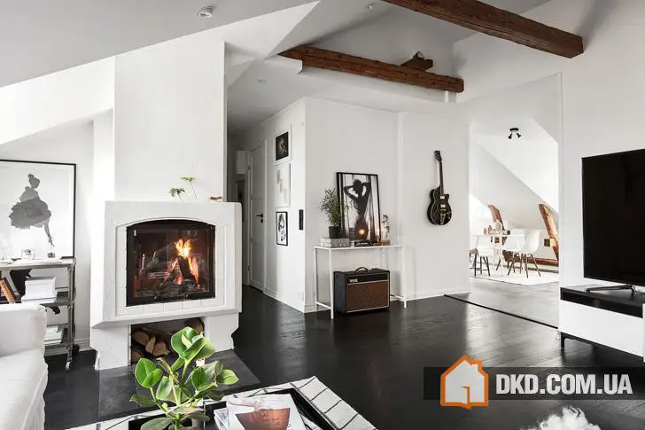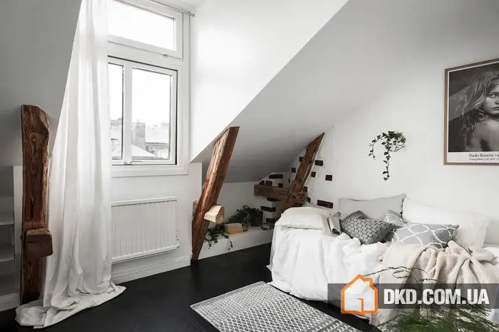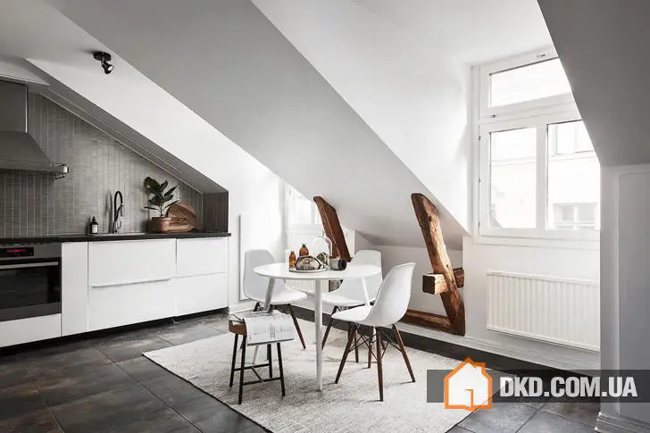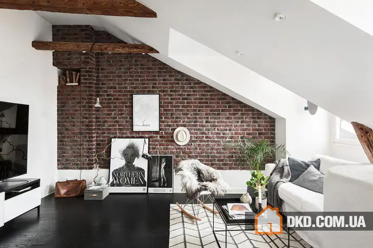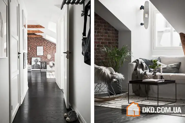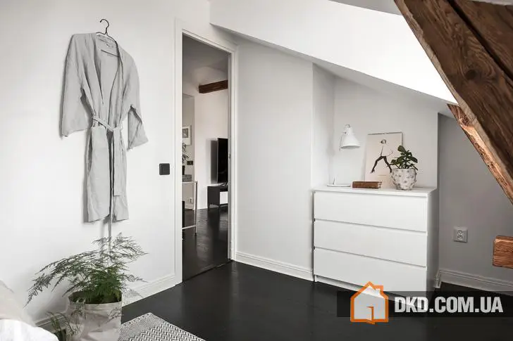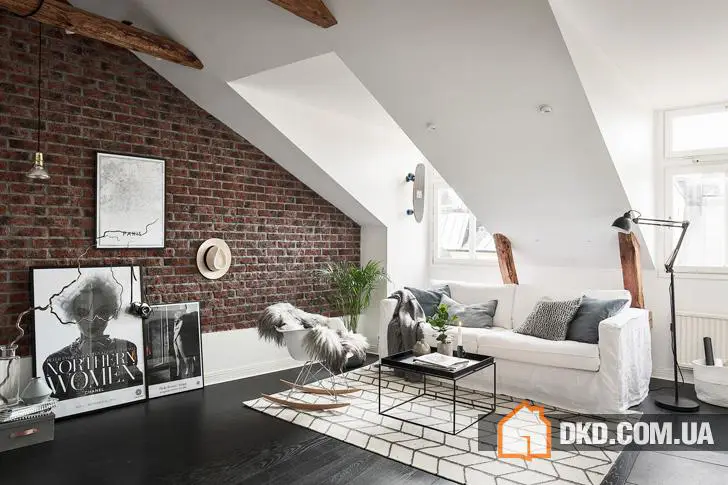 Квартира розташована на верхньому поверсі будинку в Стокгольмі та має скошені стельни та гарні дерев'яні балки. Необроблена цегляна стіна в гостьовій кімнаті надає лофті ще більше особливості. Як і в більшості скандинавських інтер'єрів, кольорова палітра підібрана нейтральна — з великим джерелом білого, сірого та чорного. Але архітектурні деталі, безумовно, роблять це житло справді особливим!