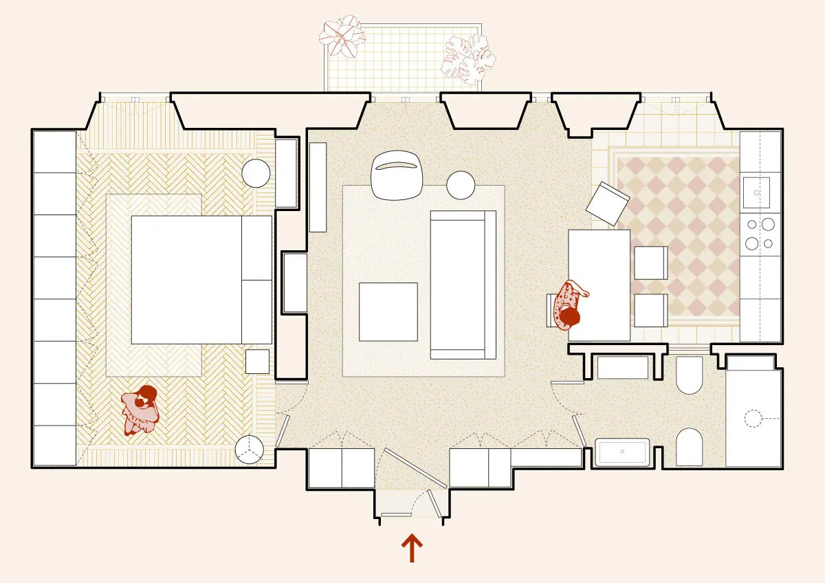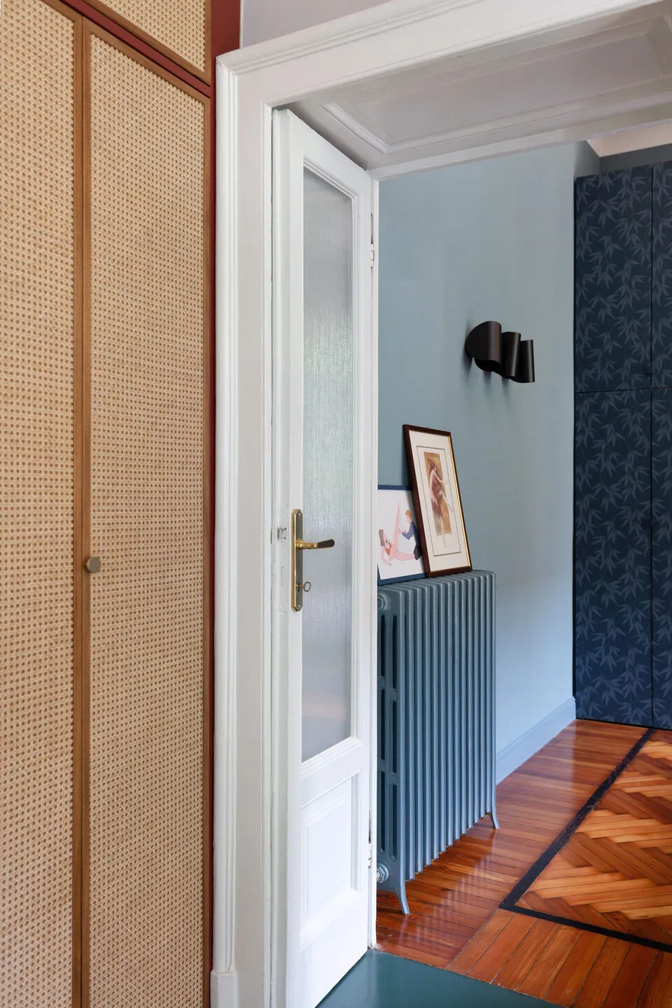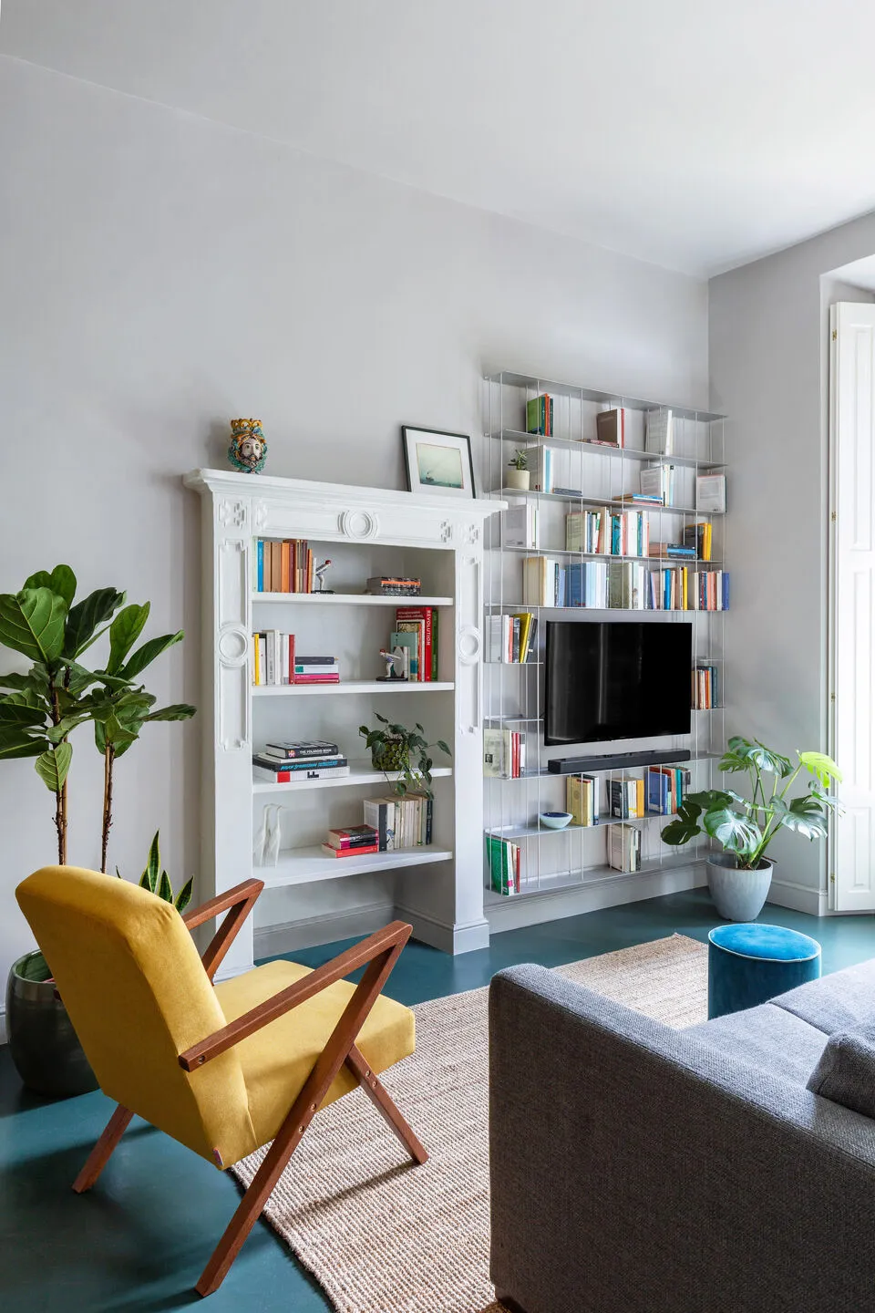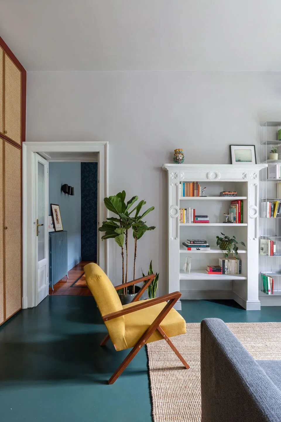 Бірюзове підлогу в гостиній цієї невеликої квартири в старовинному будинку в Мілані нагадує море, а солом'яний килим — наче піщаний пляж.